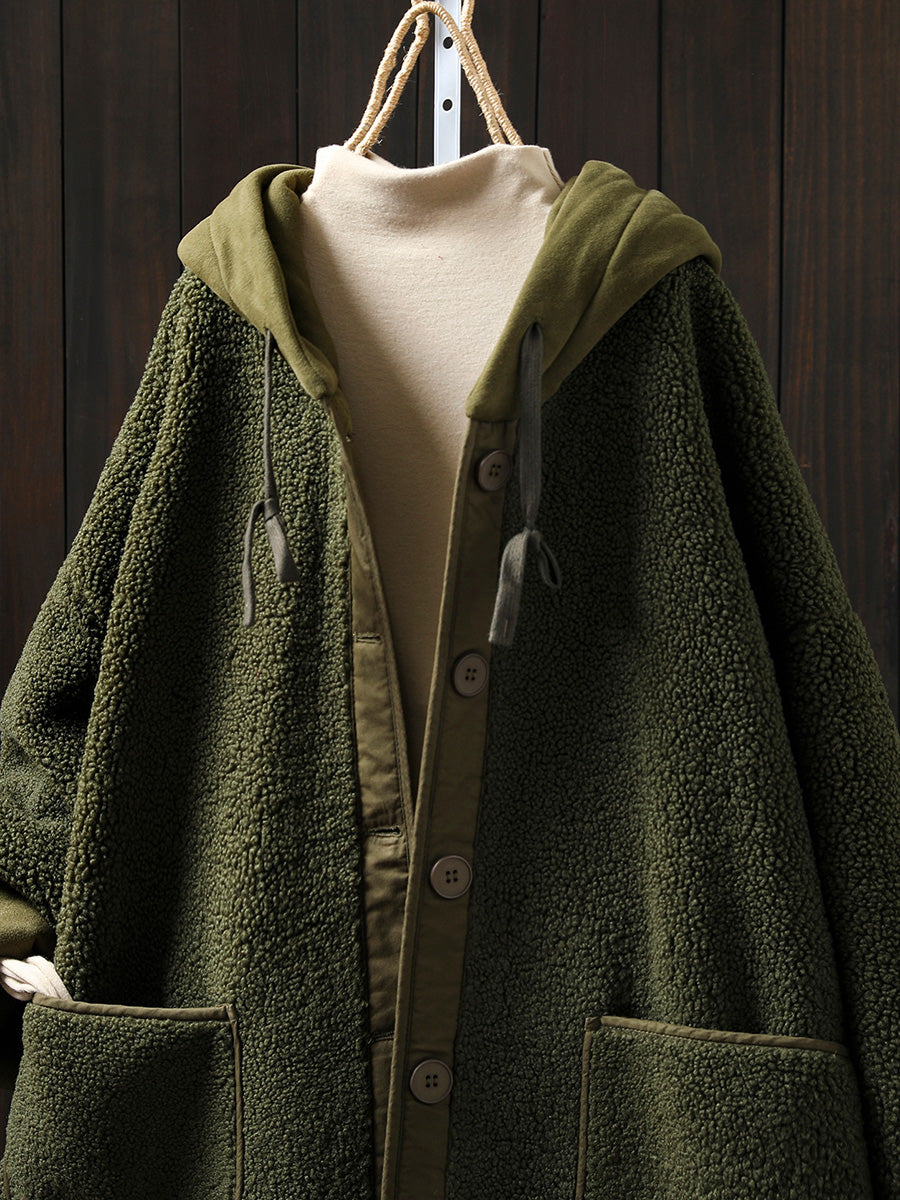 This women's coat features a solid color design with a hooded collar and full-length raglan sleeves. Its retro-inspired style makes it ideal for both autumn and winter seasons, providing warmth and comfort during colder months.