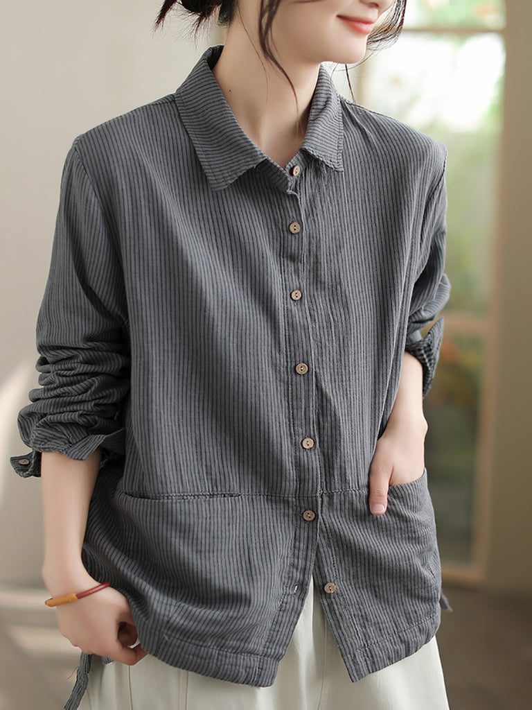 Plus Size Women Autumn Stripe Turn-down Collar Cotton Shirt