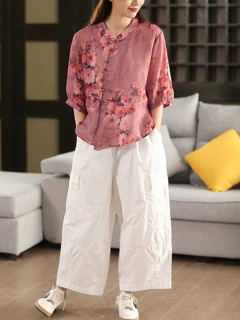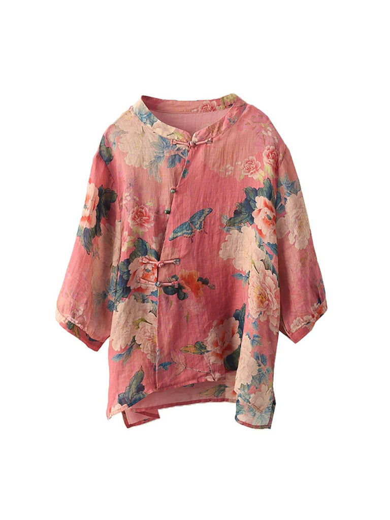 Plus Size Women Summer Retro Flower Stand Collar 100%Ramie Shirt