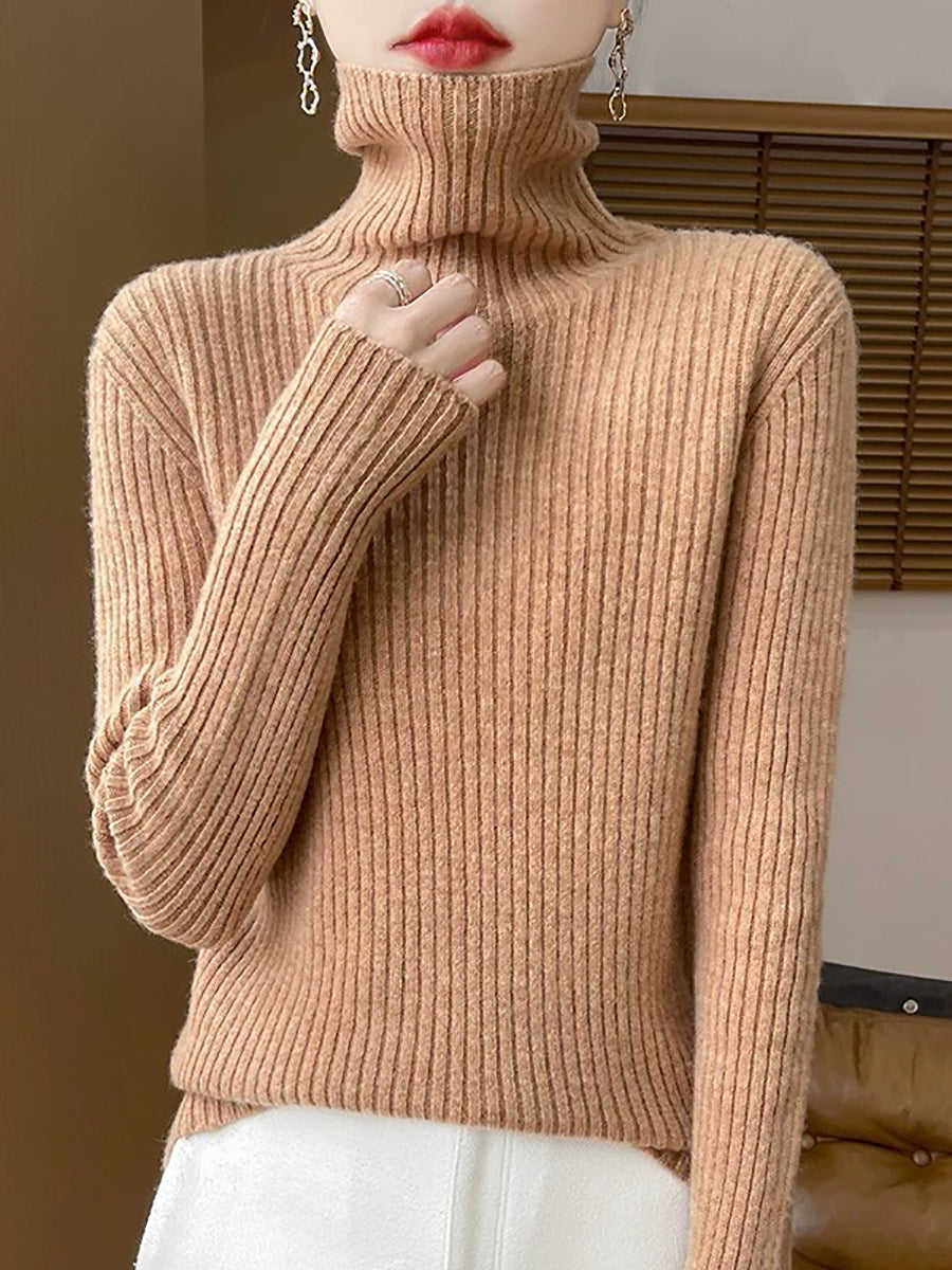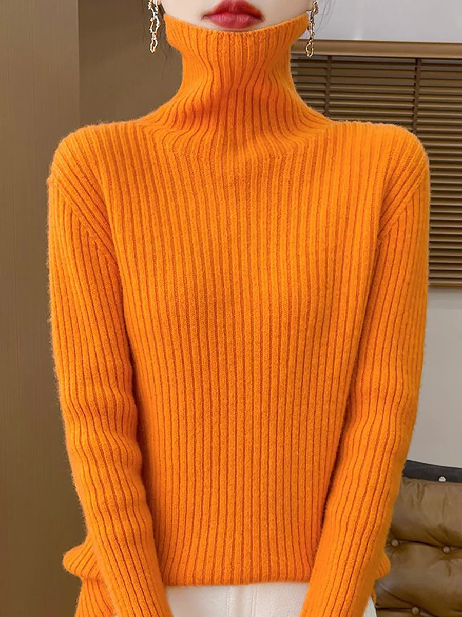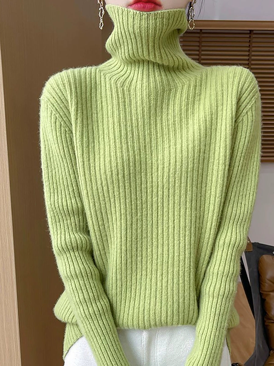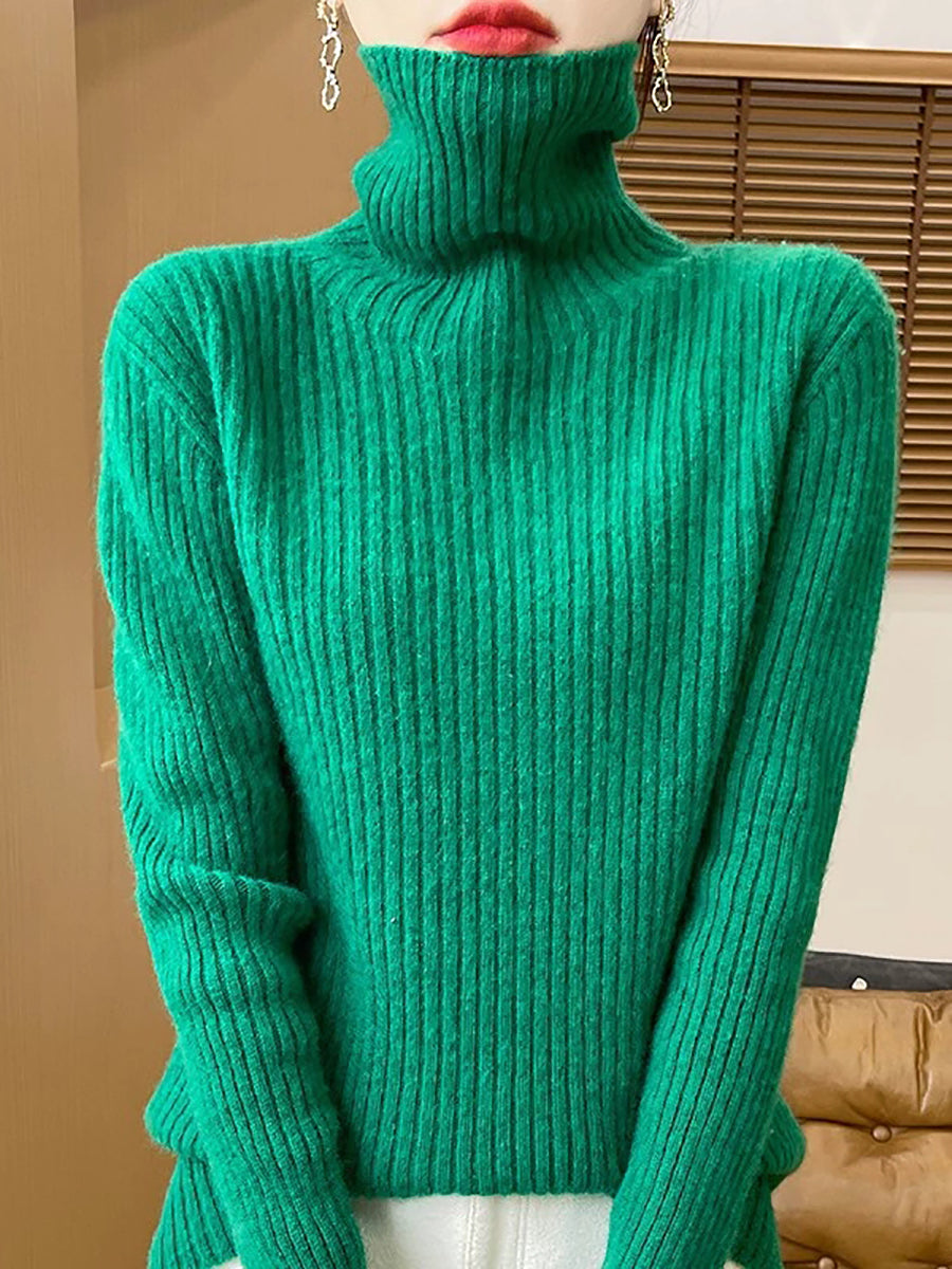 Women Spring Casual Pure Color Turtleneck Wool Sweater