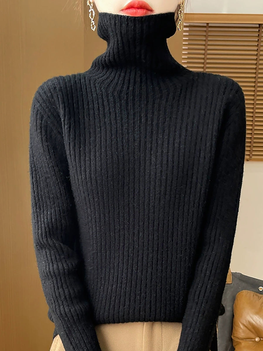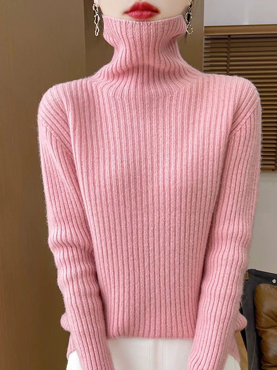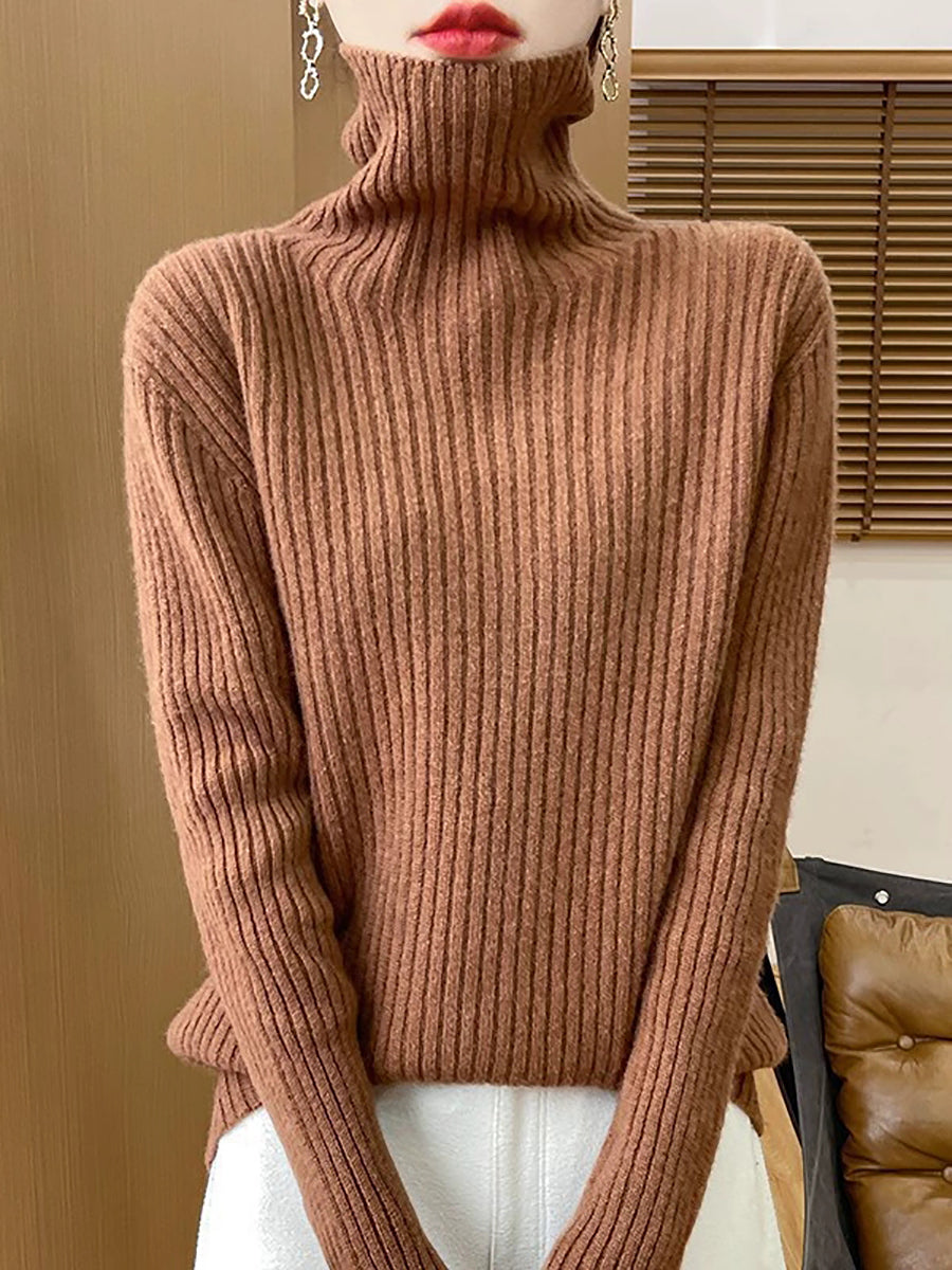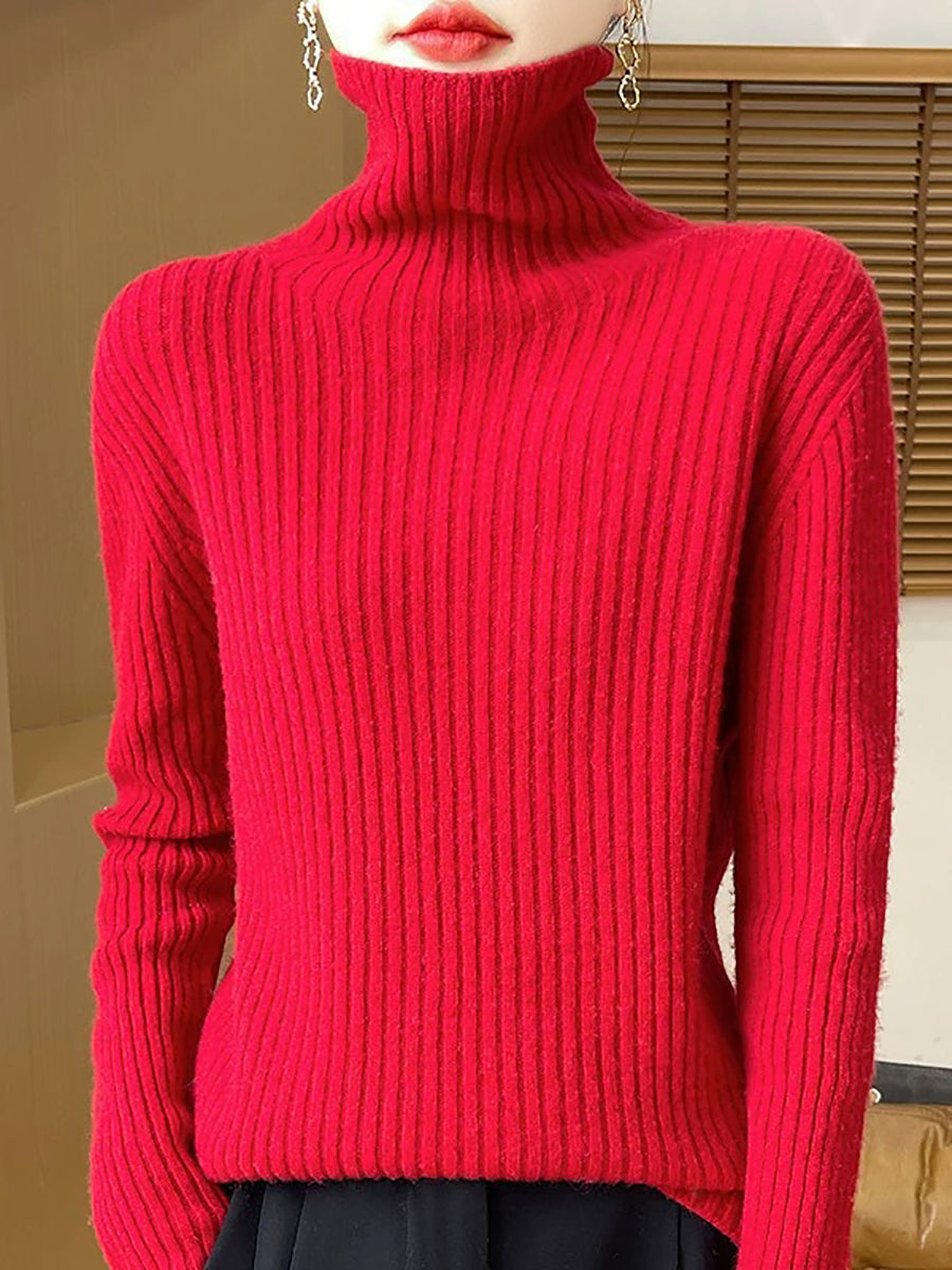 Women Spring Casual Pure Color Turtleneck Wool Sweater