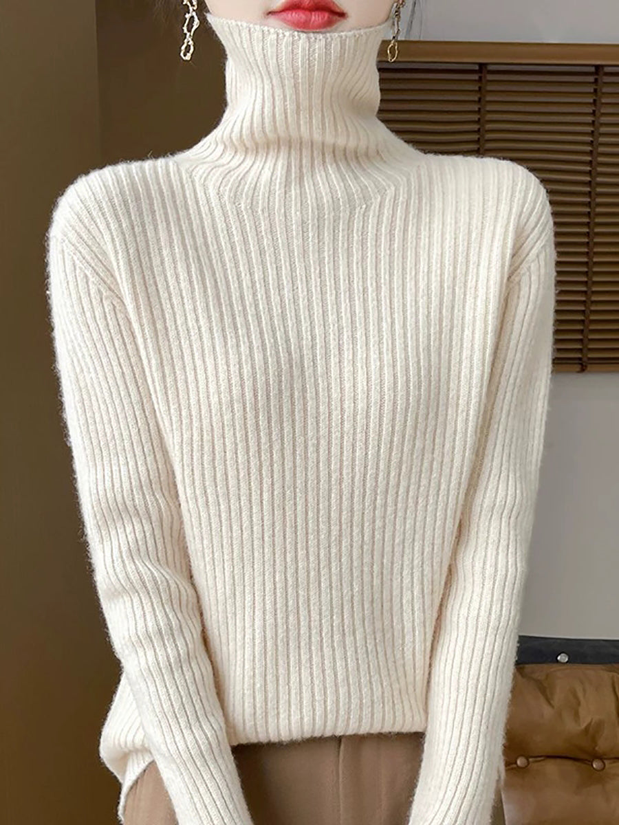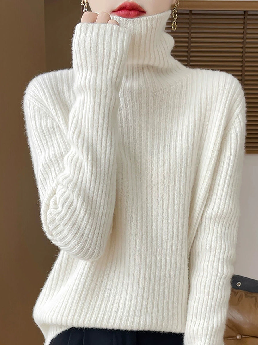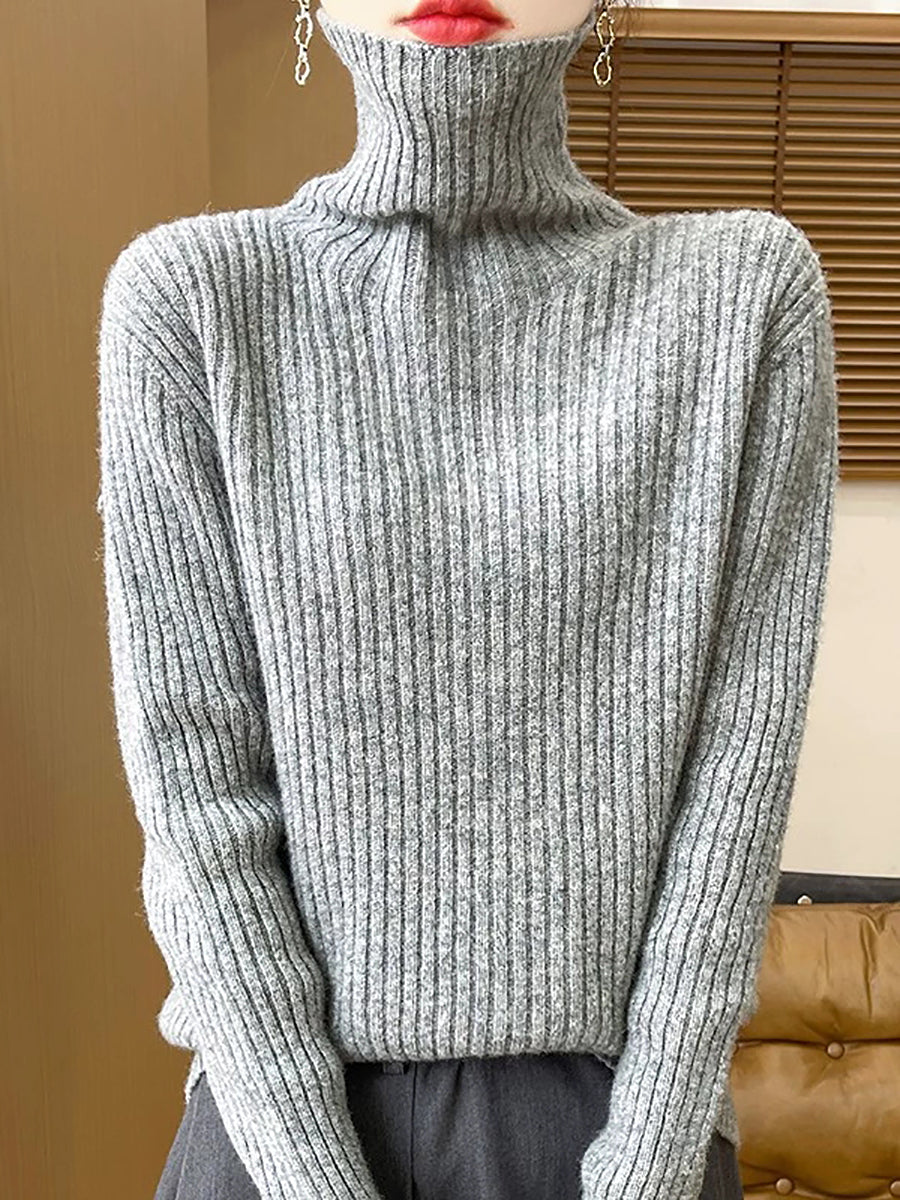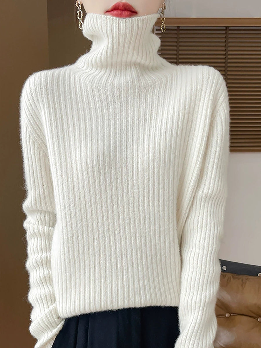 Women Spring Casual Pure Color Turtleneck Wool Sweater