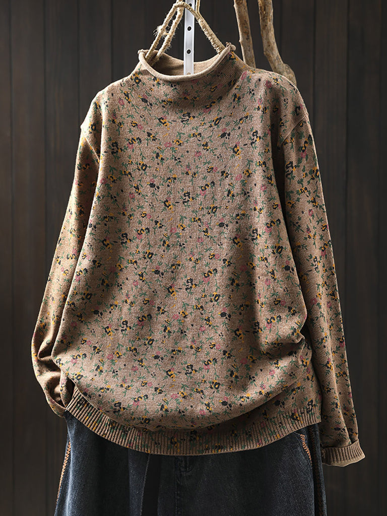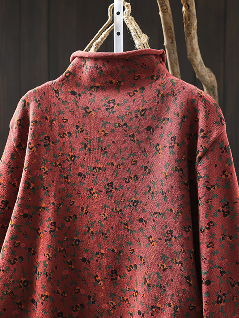 Women Autumn Artsy Floral Half-Turtleneck Knit Sweater