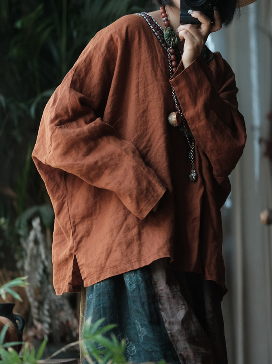 Women Autumn Retro Embroidery V-Neck Linen Shirt