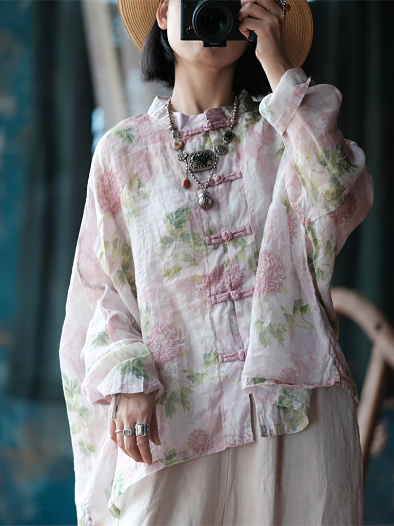 Plus Size Women Ethnic Spring Flower Stand Collar Linen Shirt