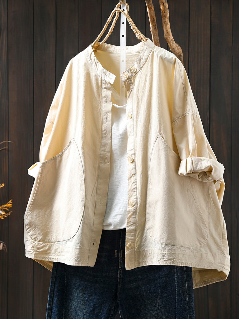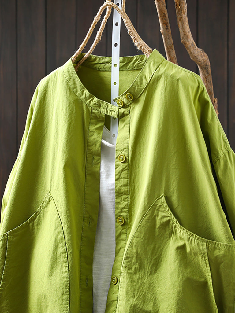 Plus Size Women Summer Casual Pure Color Stand Collar Cardigan Shirt