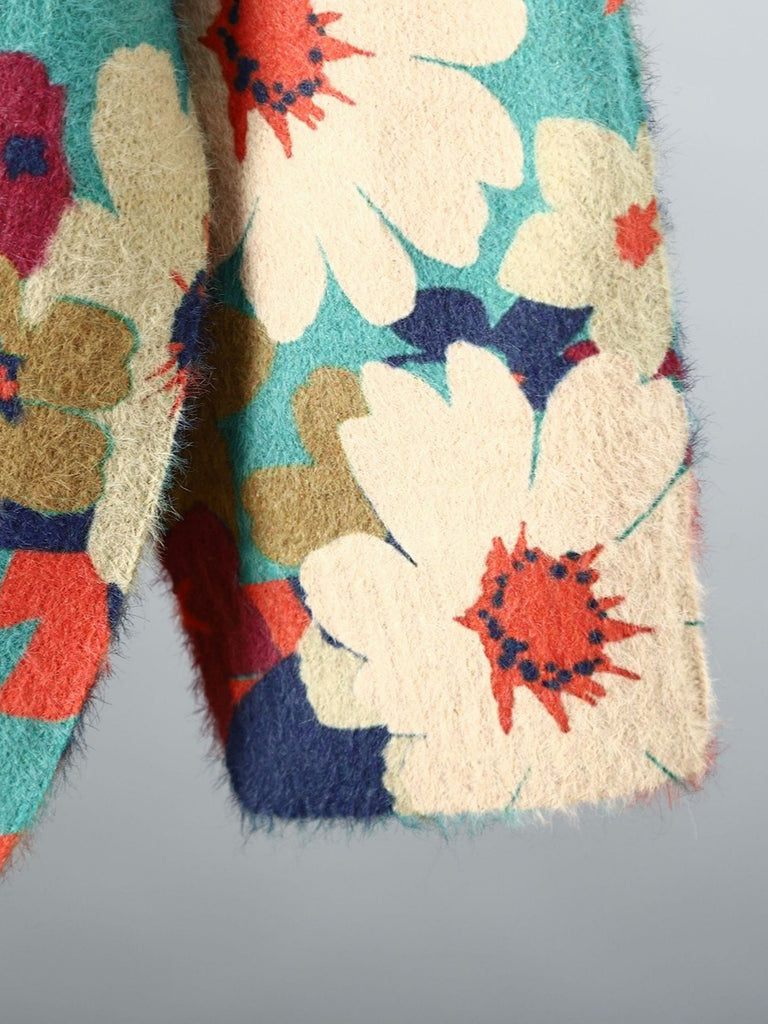 This product boasts a composition of 75% Core-spun yarn 25% Mink velvet and a charming floral pattern, complete with a sleek V-neck and full raglan sleeves, making it perfect for the casual, yet elegant woman's winter wardrobe. Suitable for the cooler autumn and winter months.