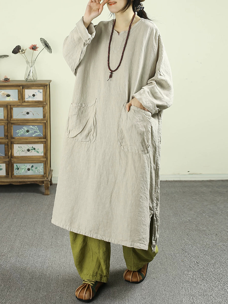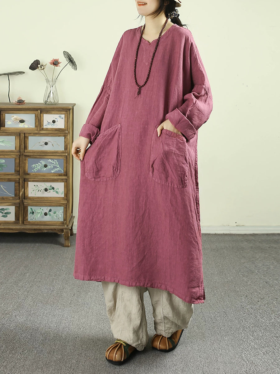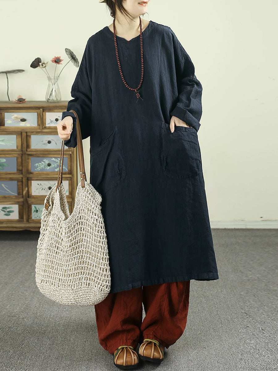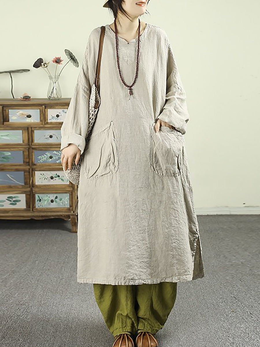 Women Spring Retro Pure Color 100%Linen O-Neck Dress