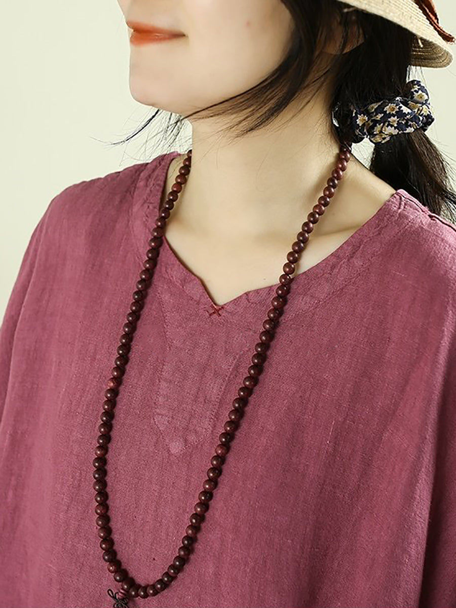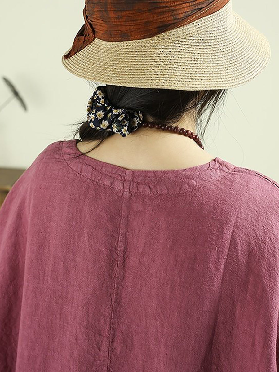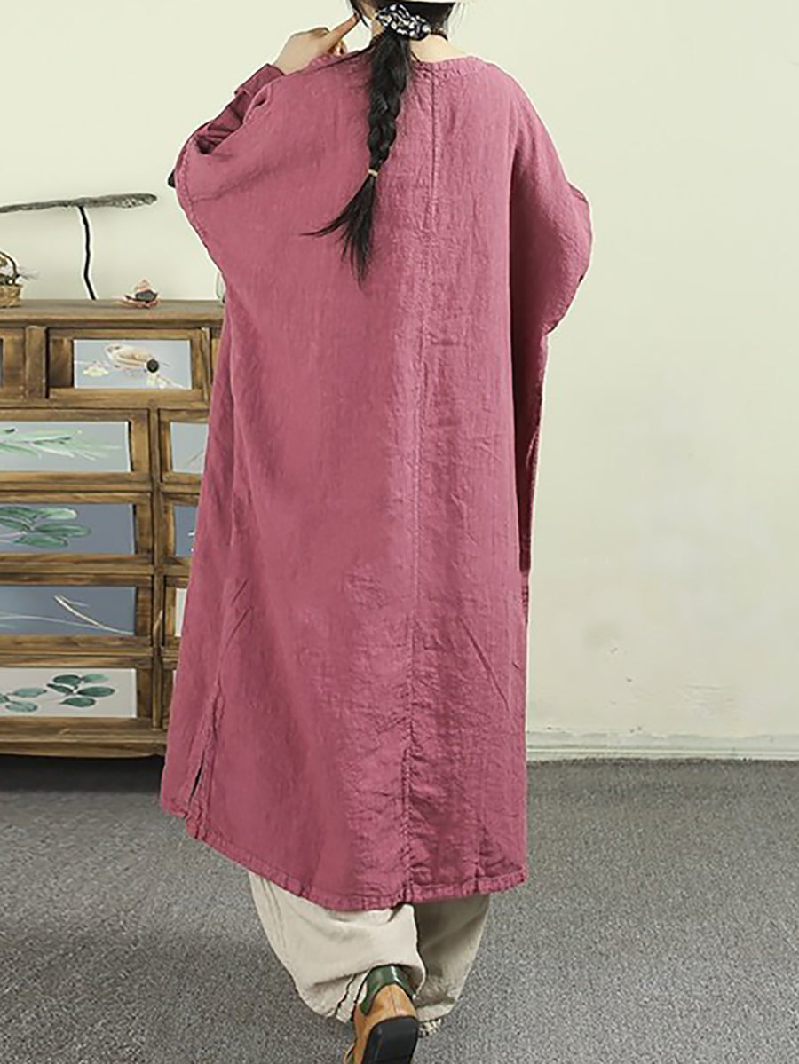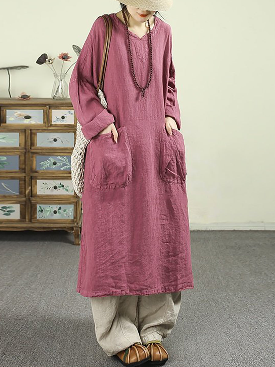 Women Spring Retro Pure Color 100%Linen O-Neck Dress