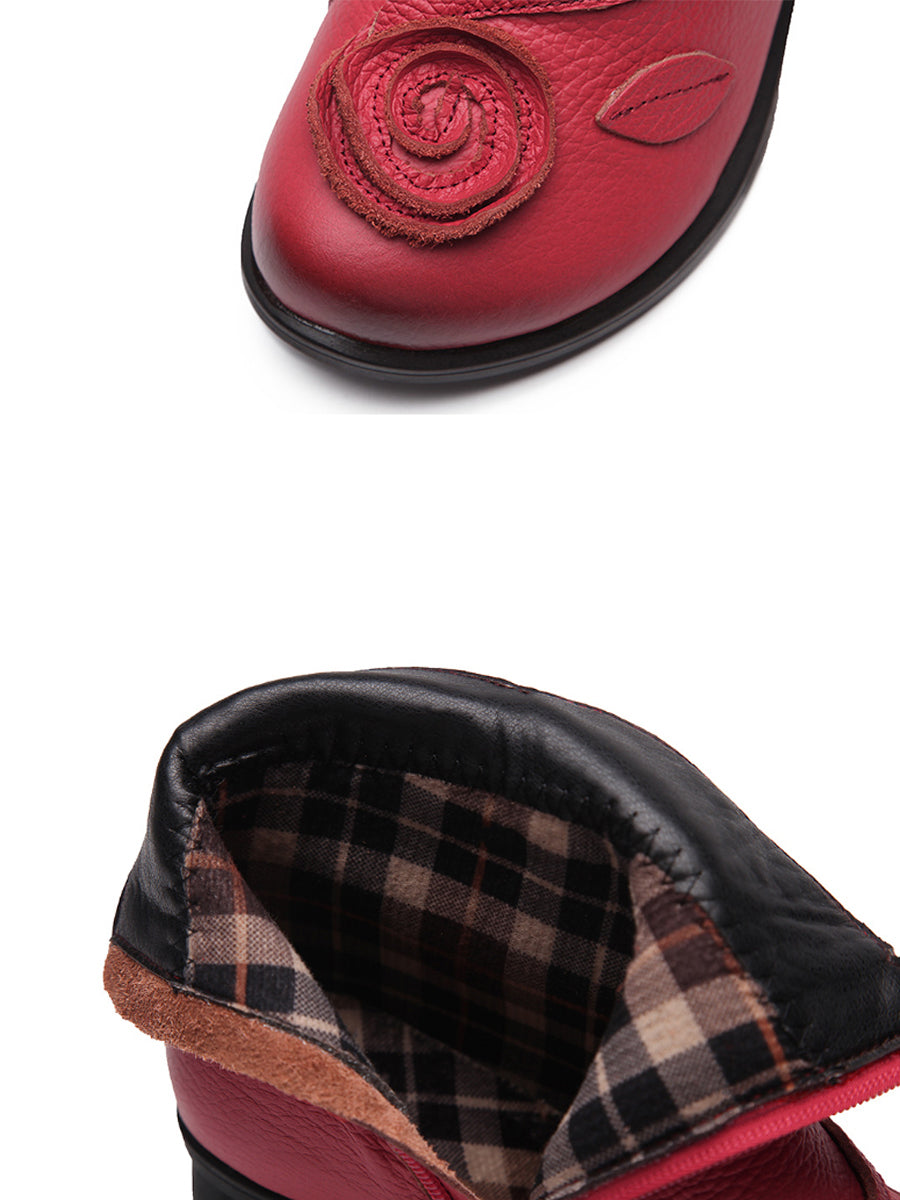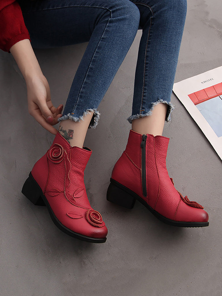 Women Retro Flower Leather Solid Mid-Heel Boots