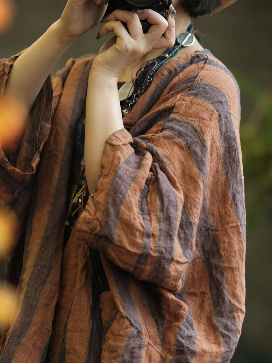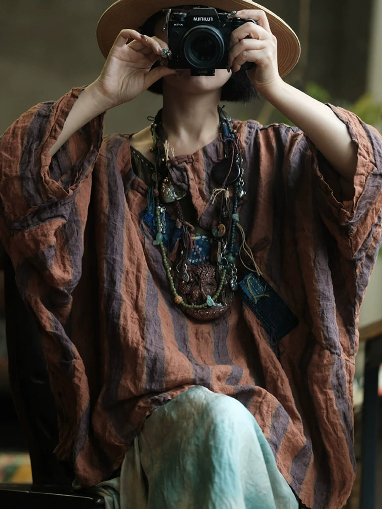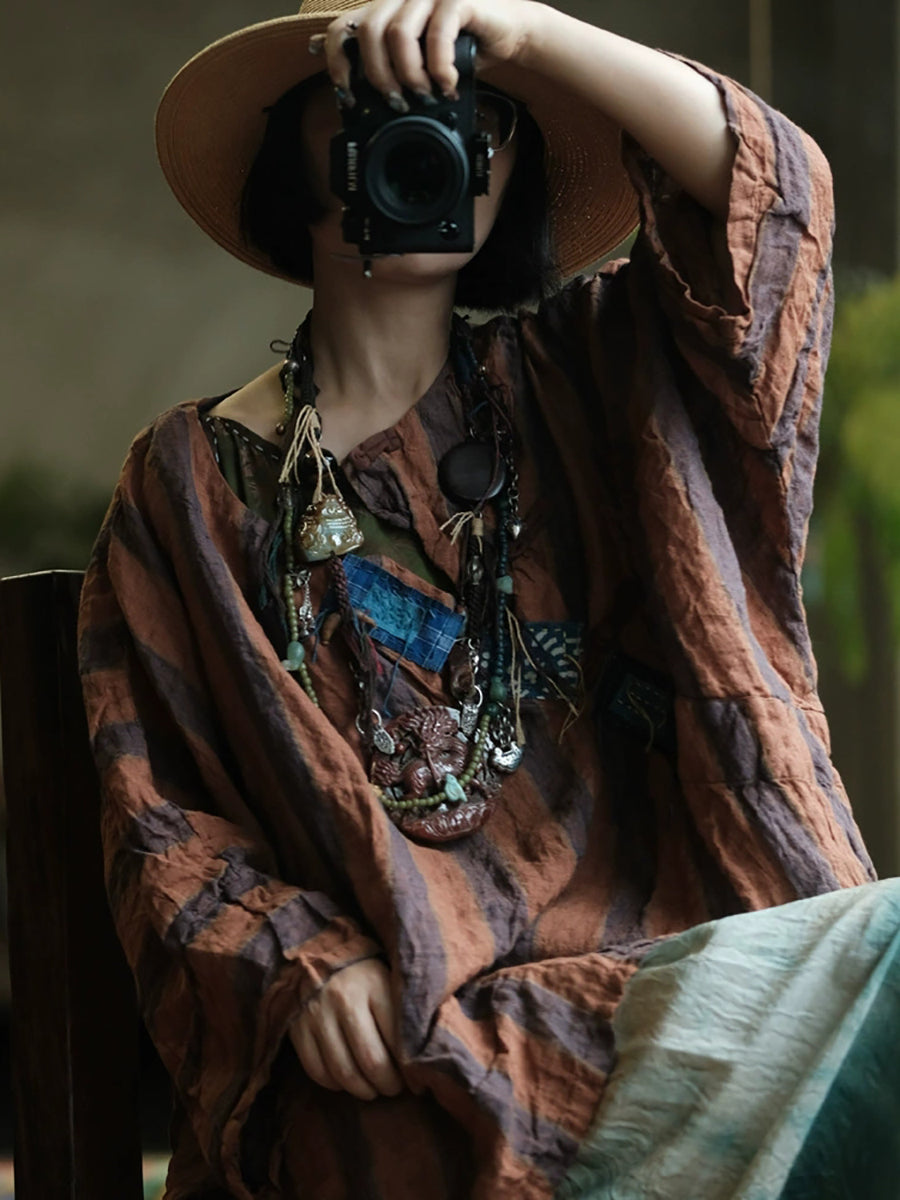 Women Summer Retro Stripe Patch O-Neck Linen Shirt