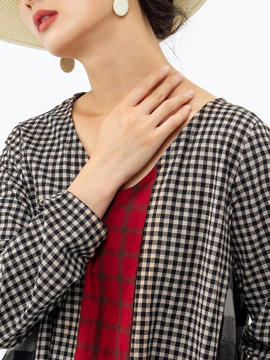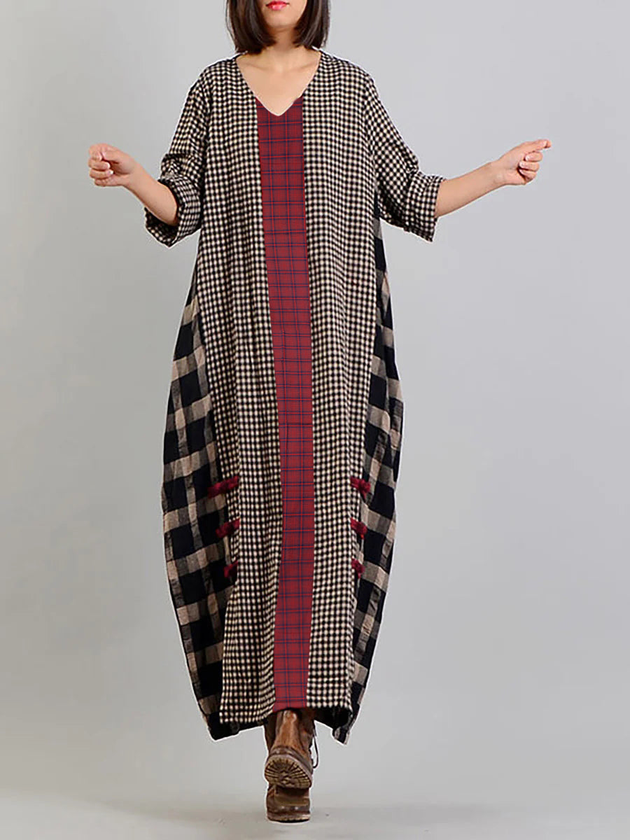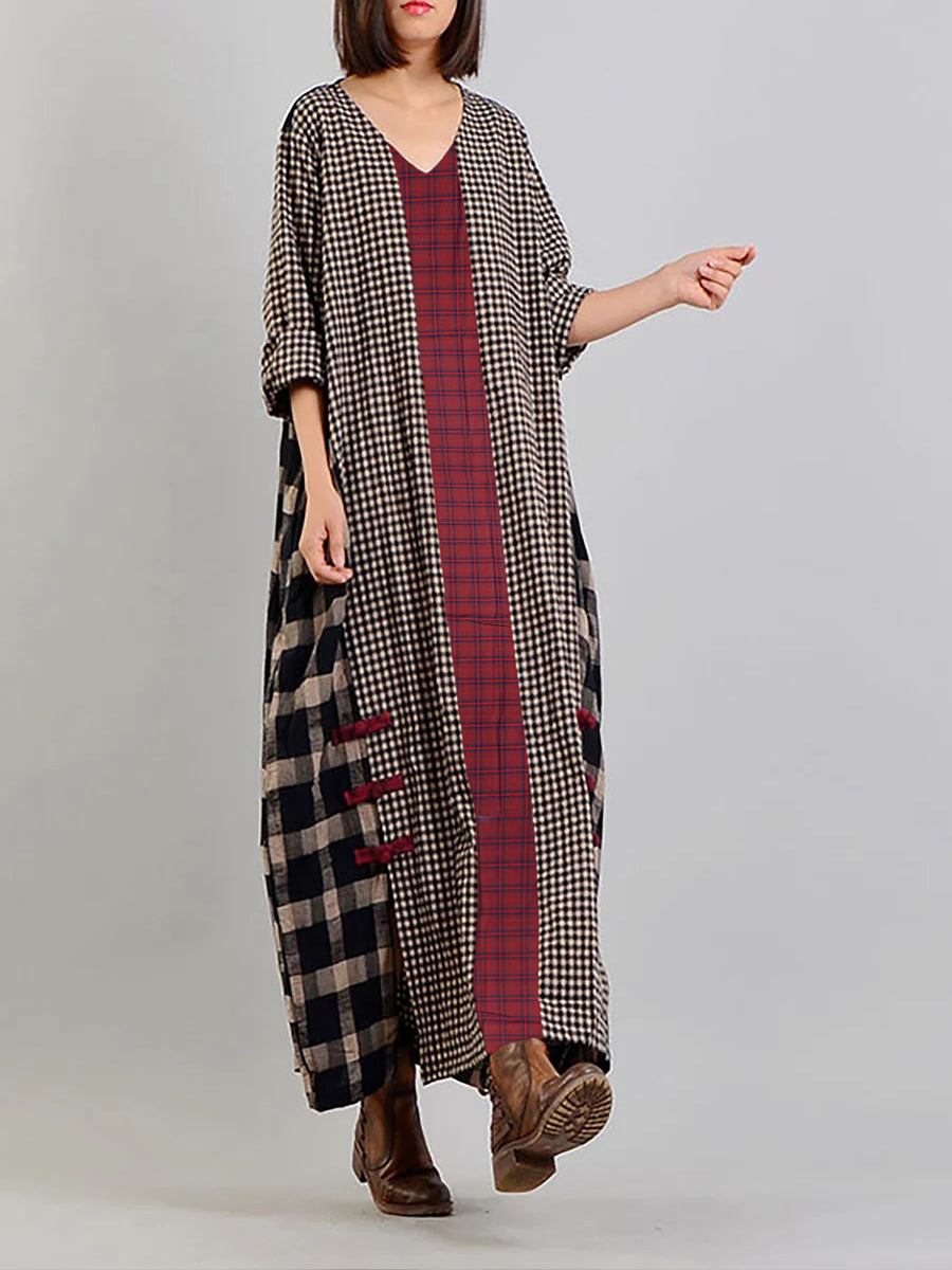 Plus Size Different Colored Plaid Retro Cotton Linen Dress