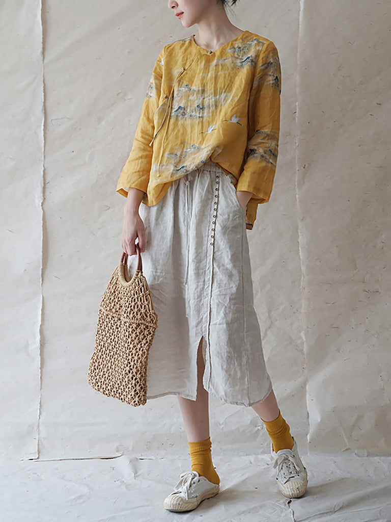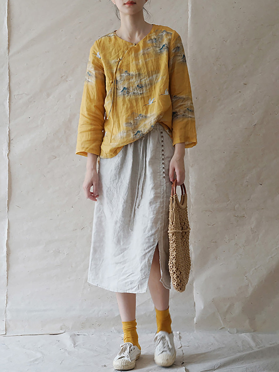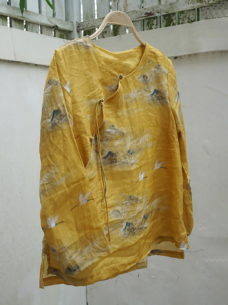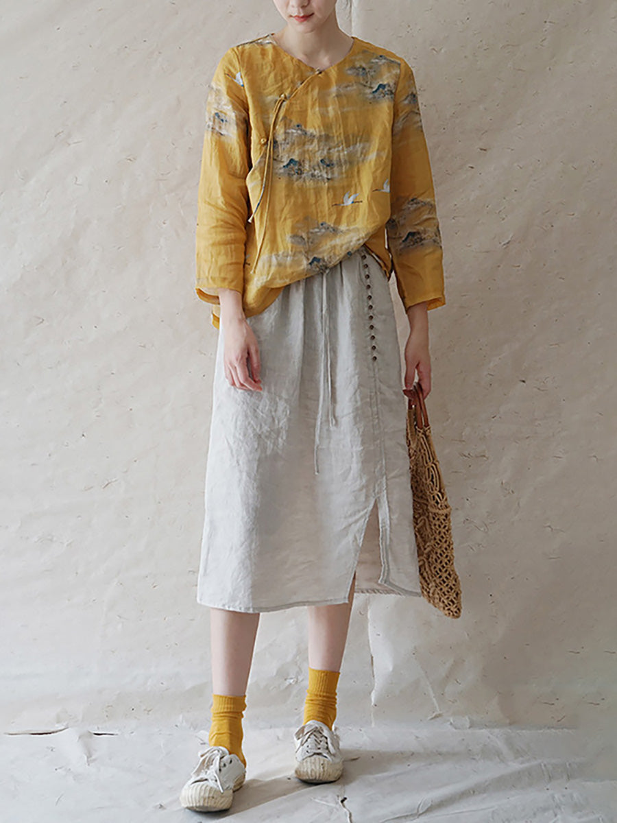 Plus Size Women Vintage Floral Slanted Ramie Shirt