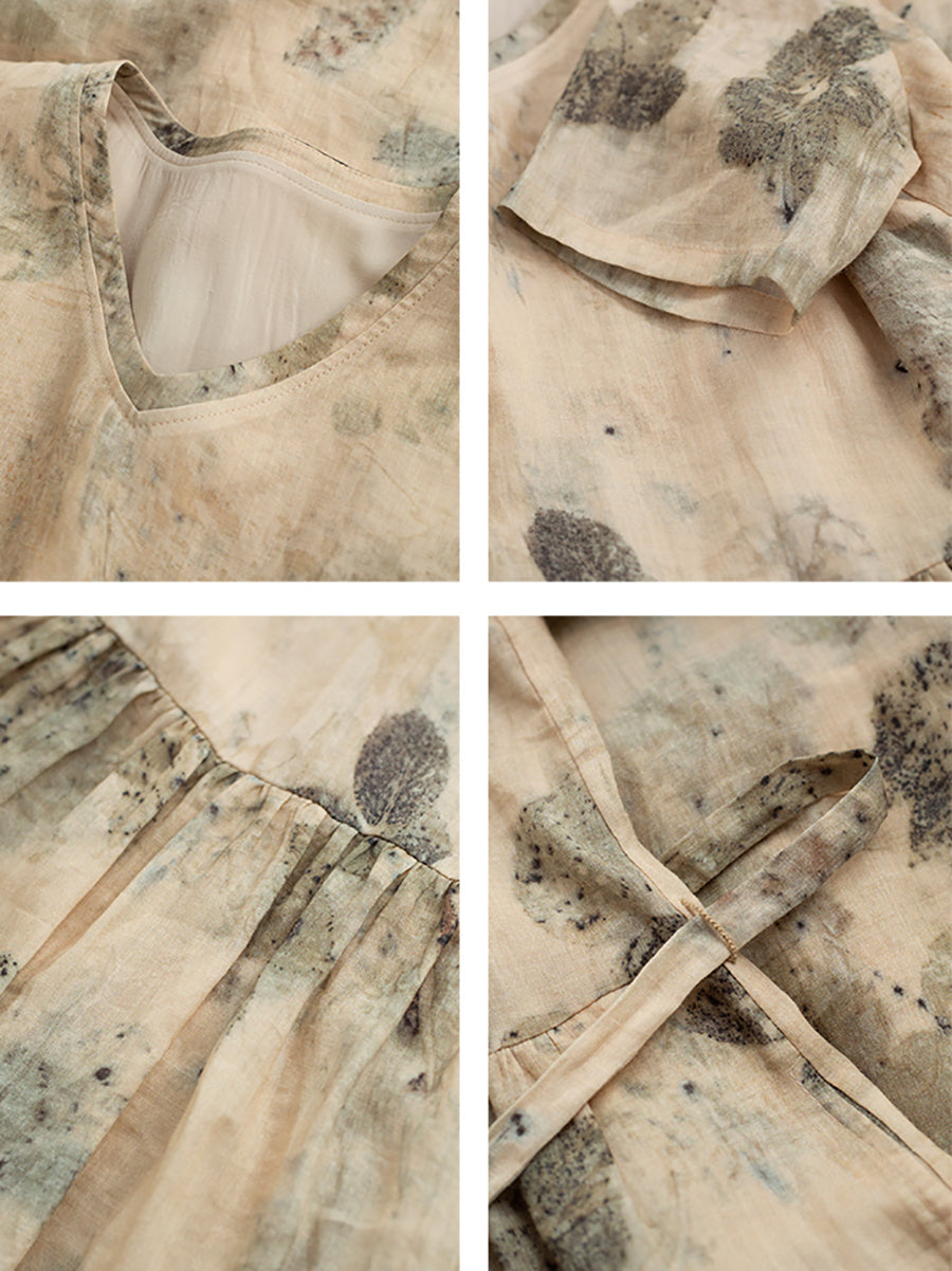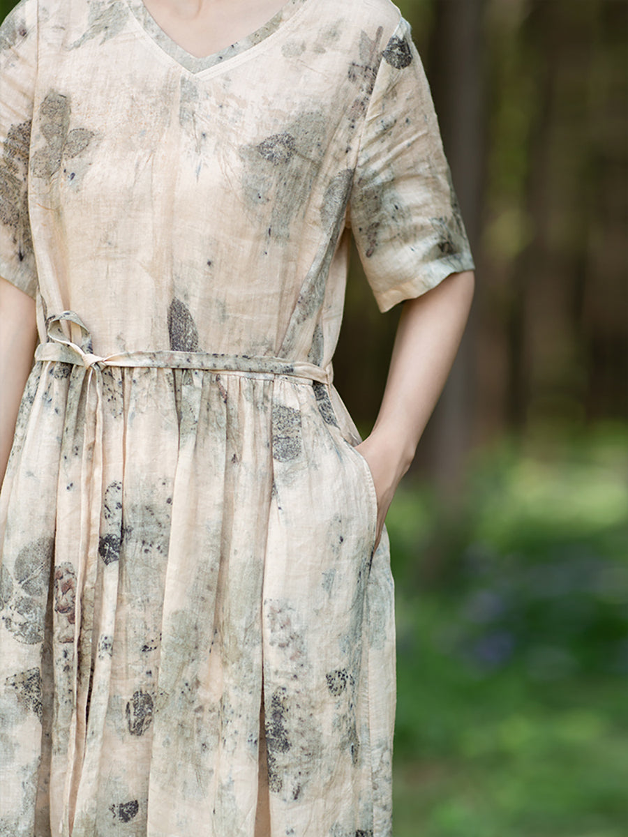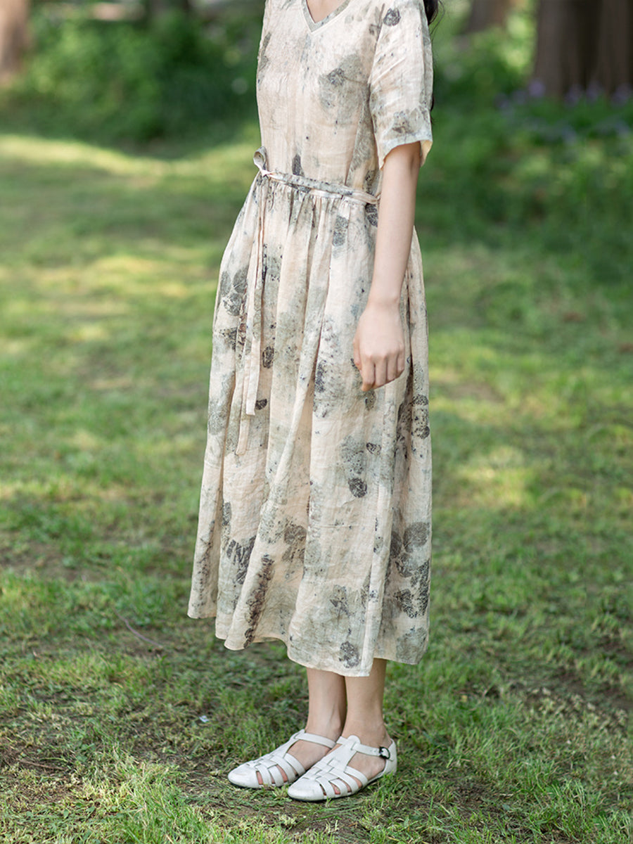 Plus Size Women Artsy Ink-Print Drawstring Ramie Dress