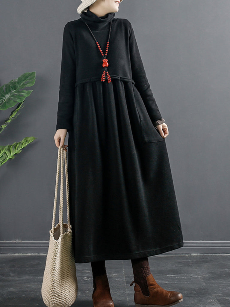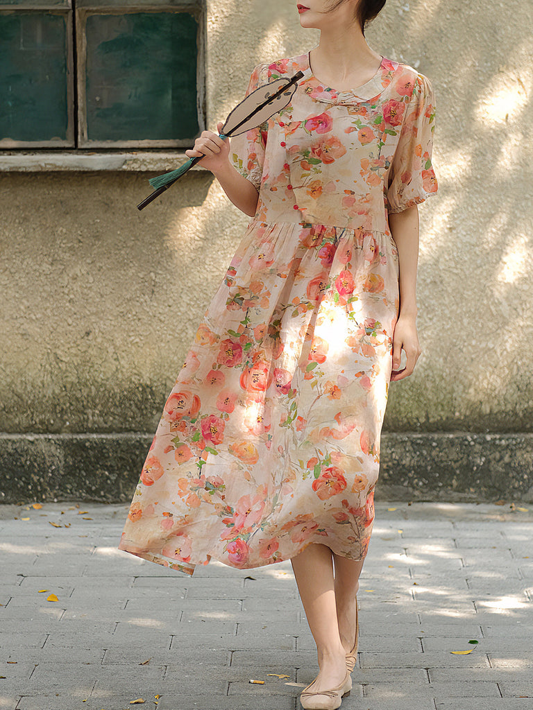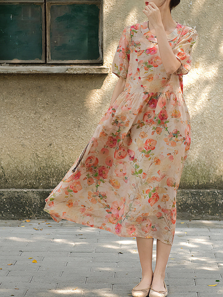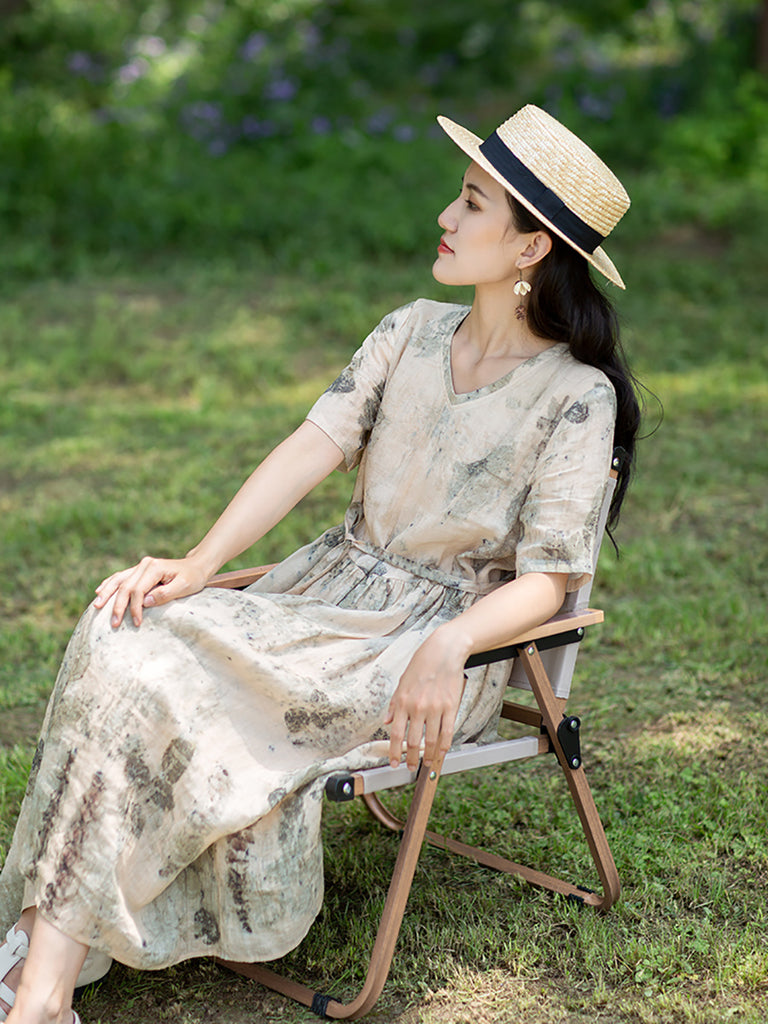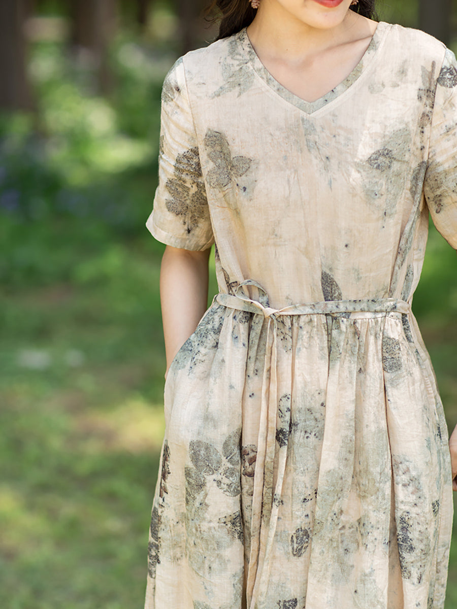 Plus Size Women Artsy Ink-Print Drawstring Ramie Dress