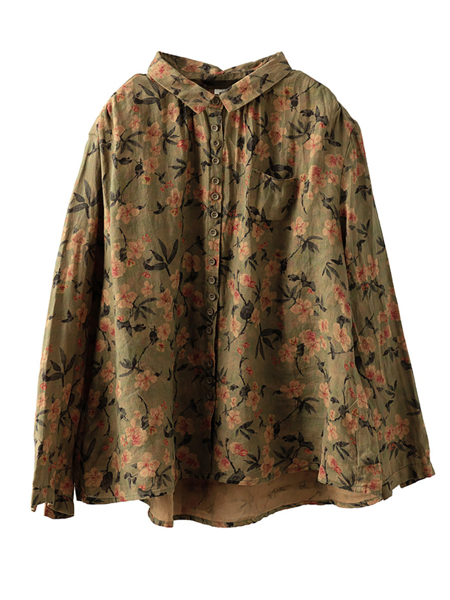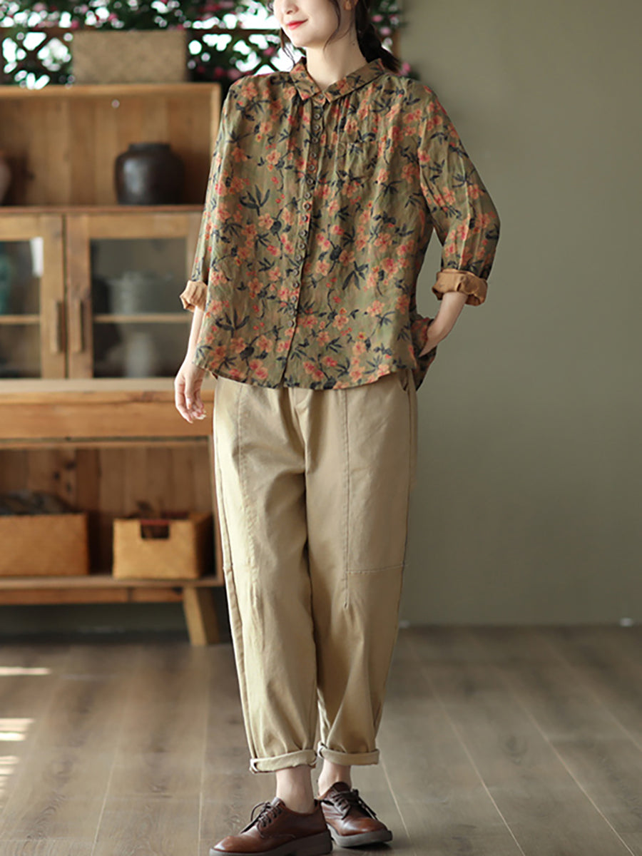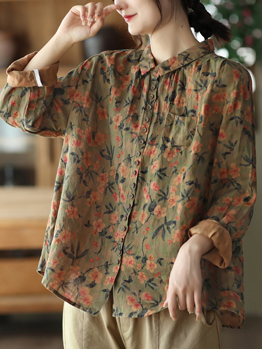 Summer Vintage Printed Linen Shirt Turn-down Collar Top