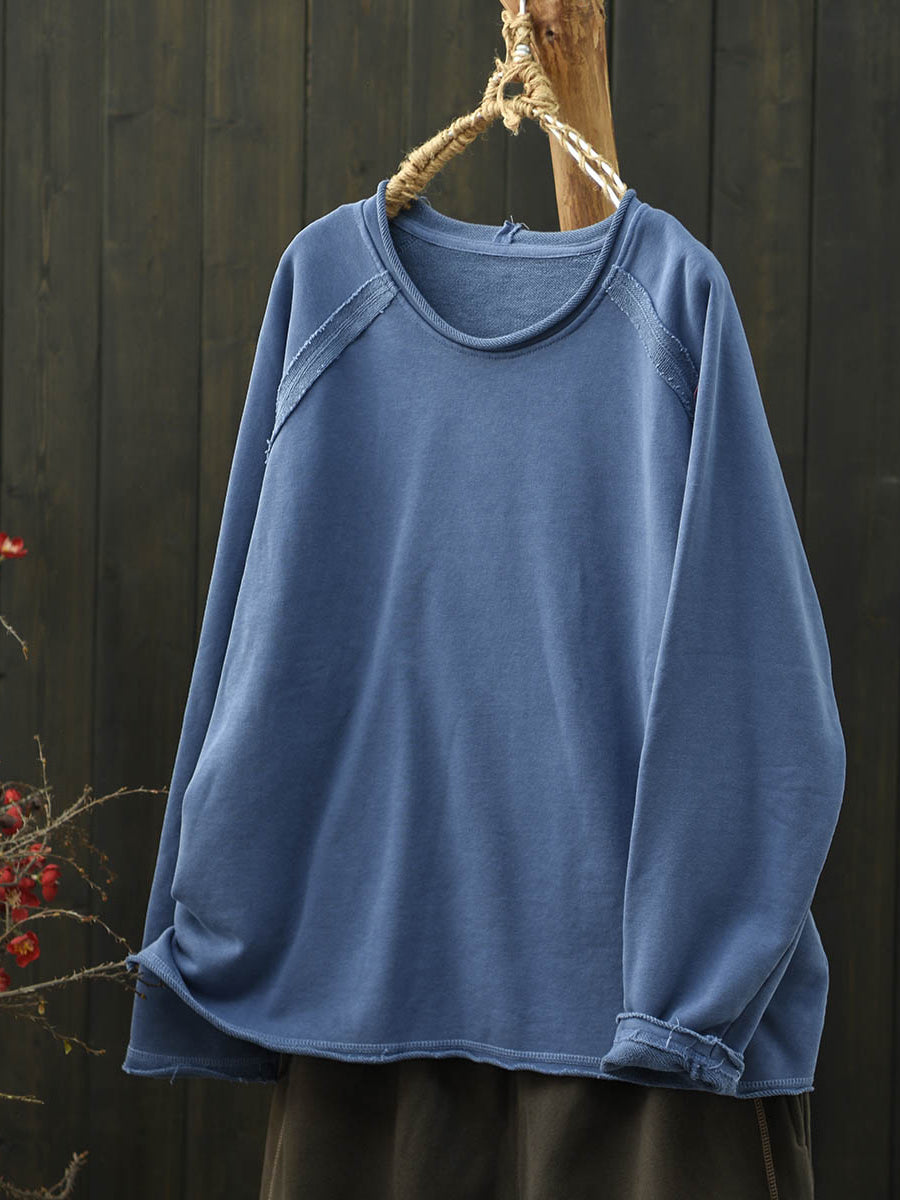 Women Artsy Autumn Pure Color Spliced O-Neck Cotton Blouse