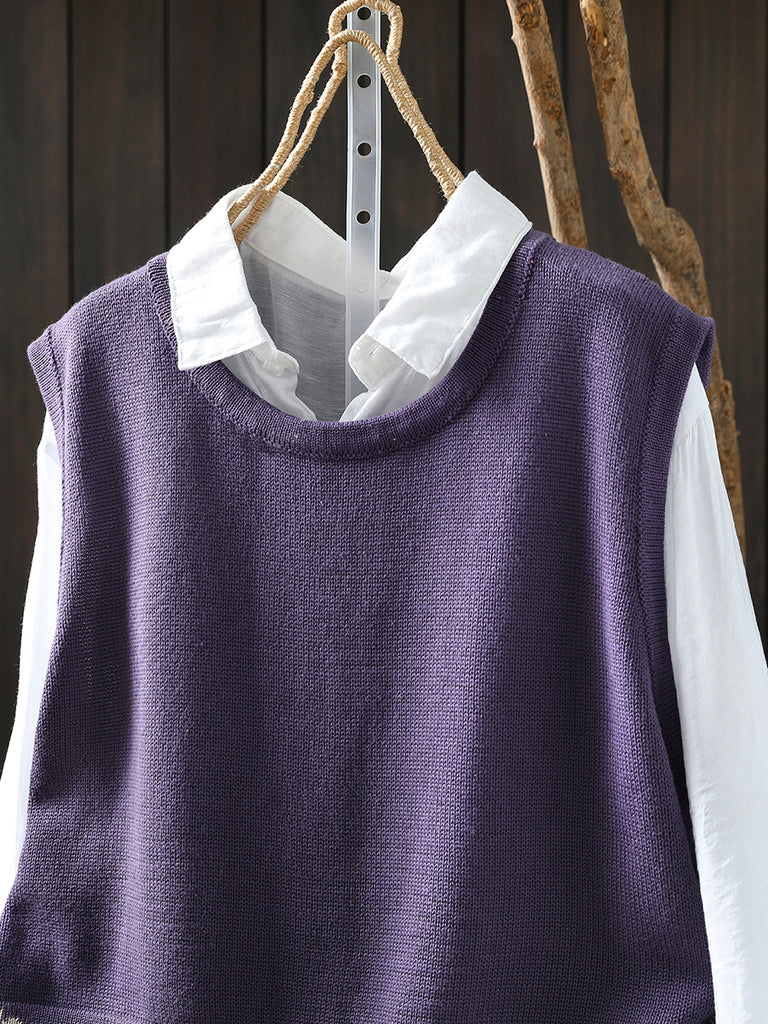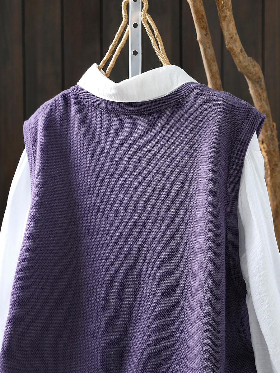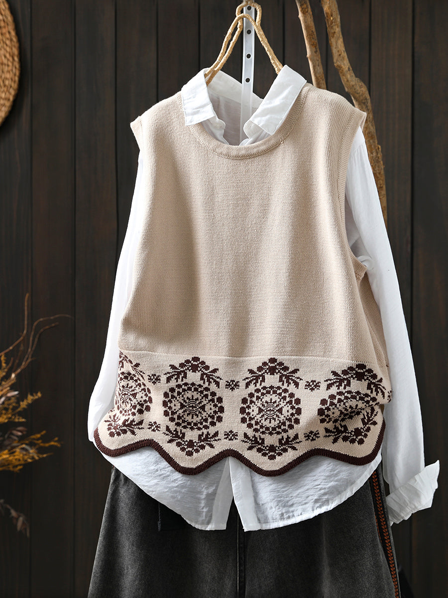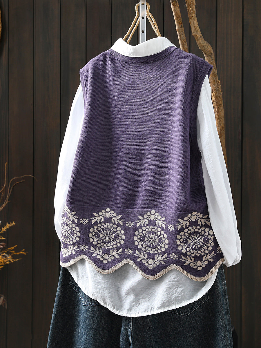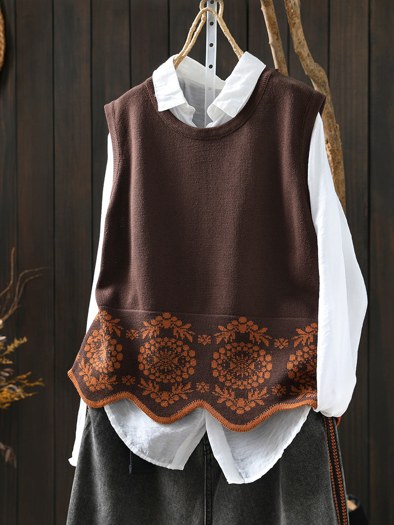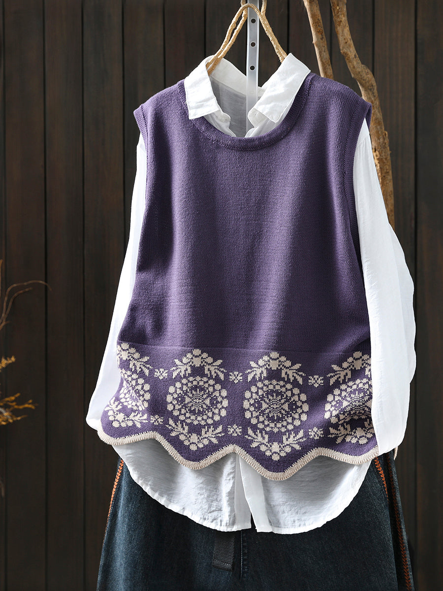 Women Artsy Flower Wave Hem O-Neck Knitted Vest
