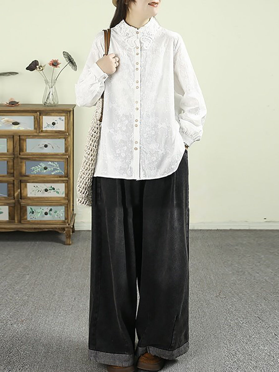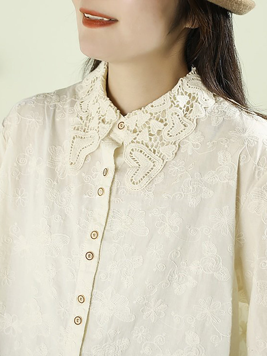 Women Artsy Spring Embroidery Lace 100%Cotton Shirt