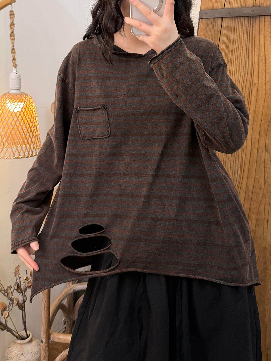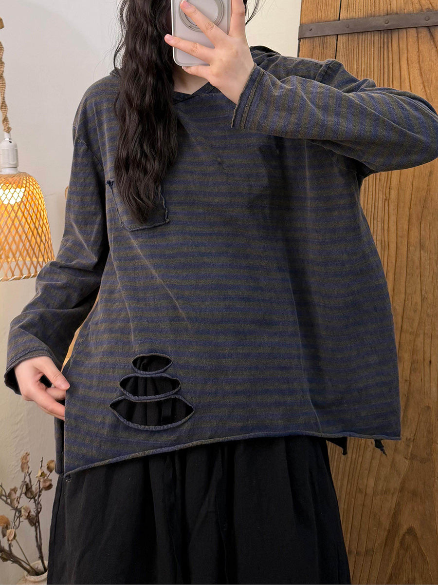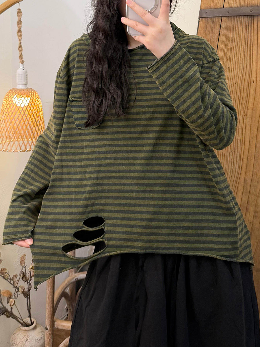 Women Artsy Spring Stripe O-Neck Frayed Cotton Blouse
