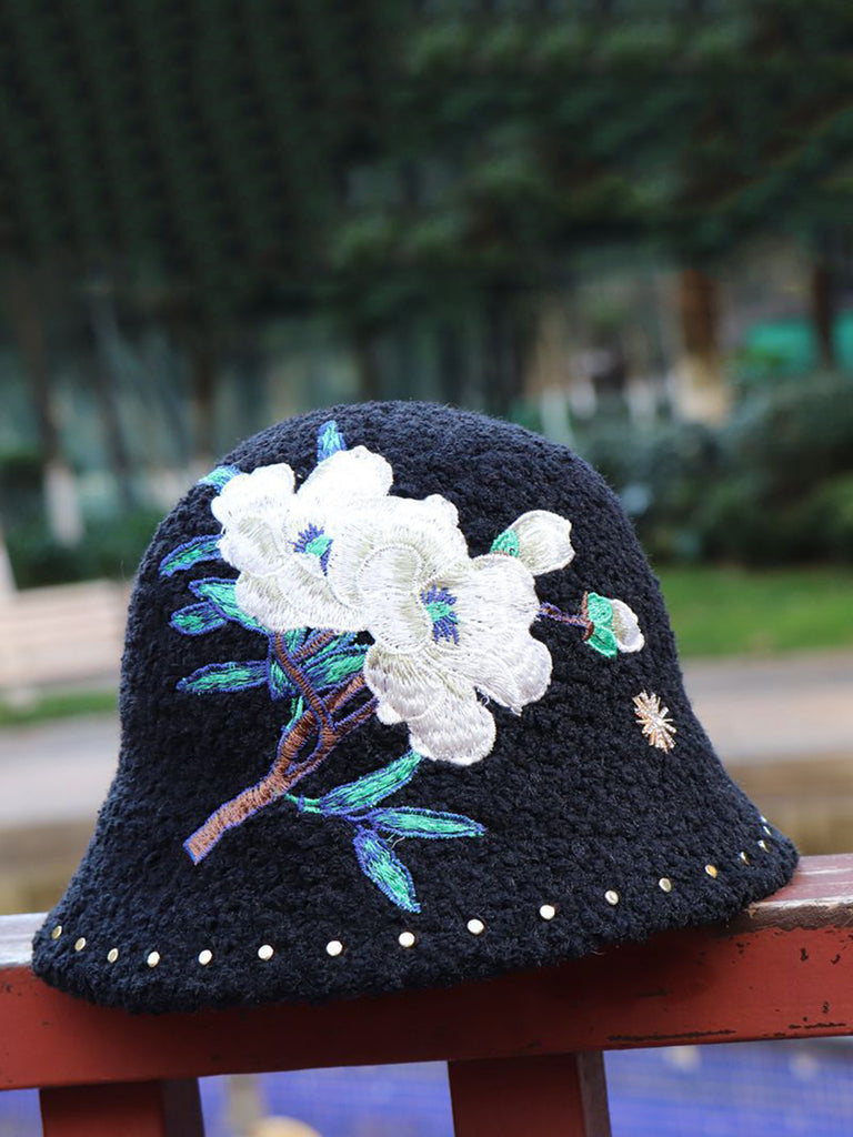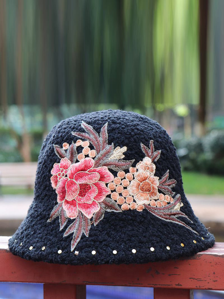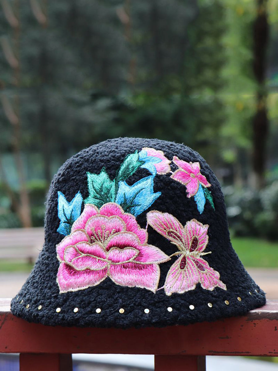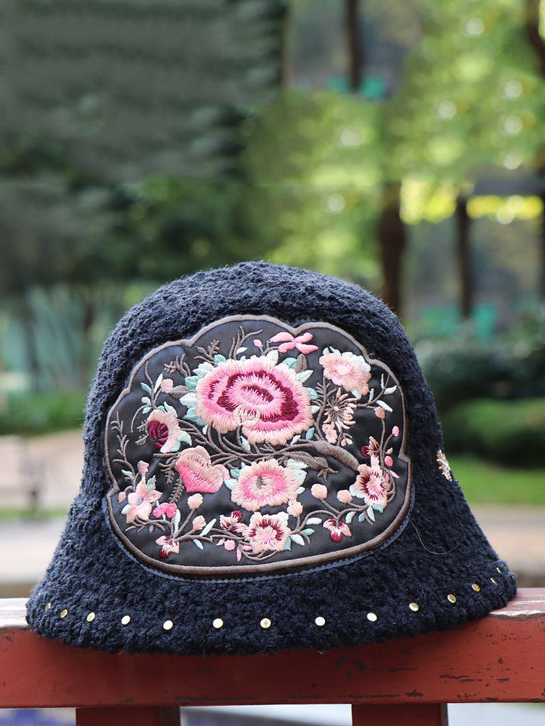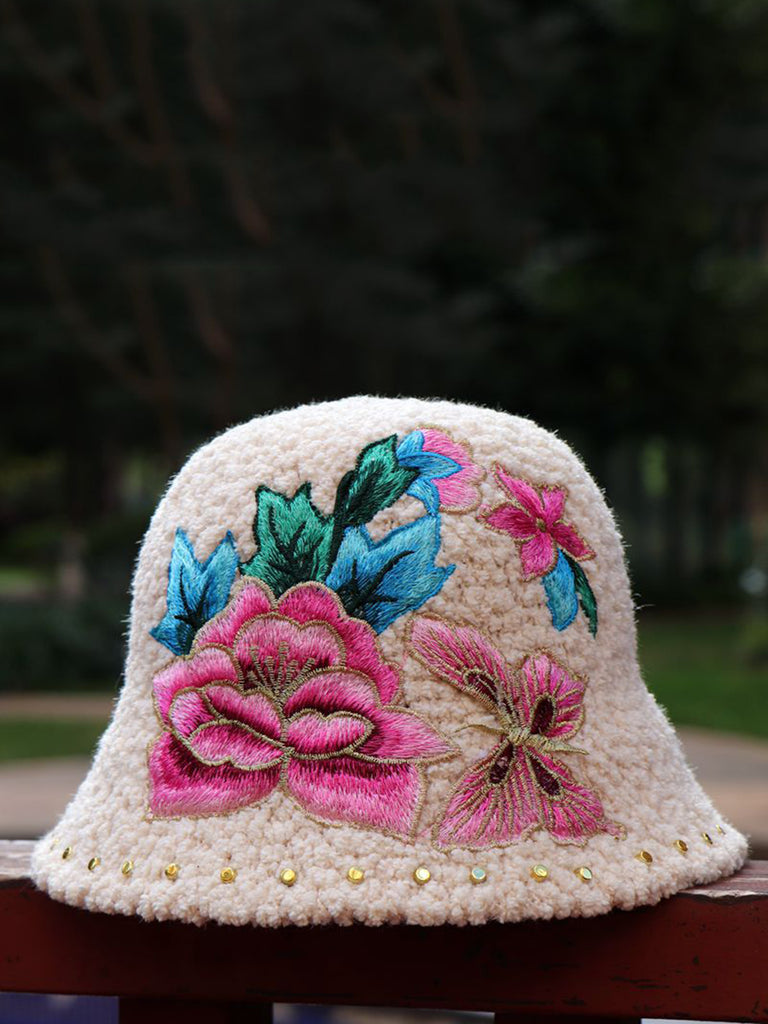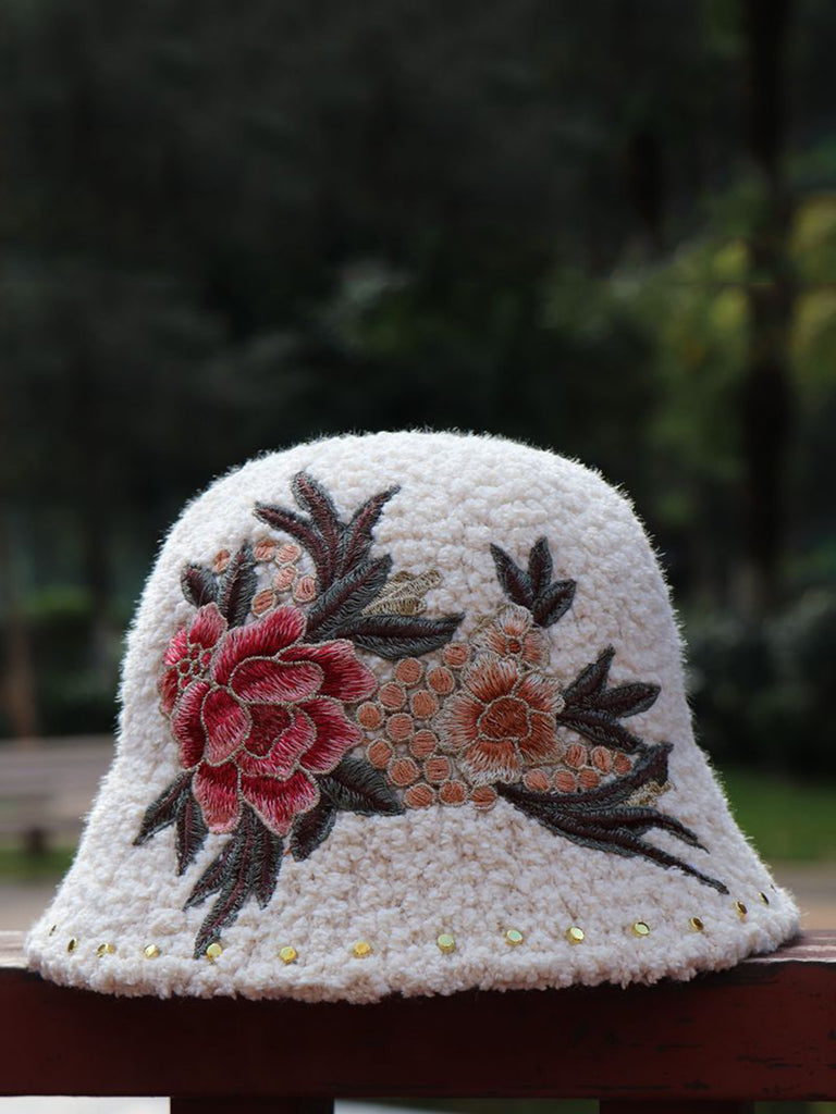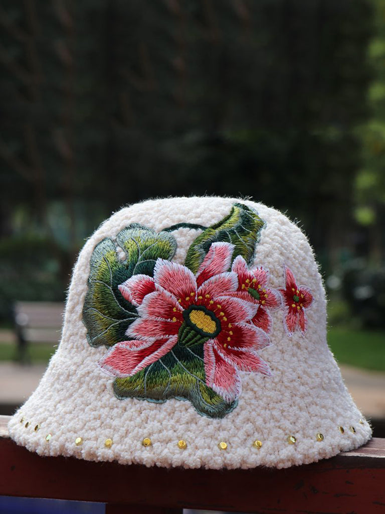 Women Artsy Winter Flower Embroidery Fleece Hat