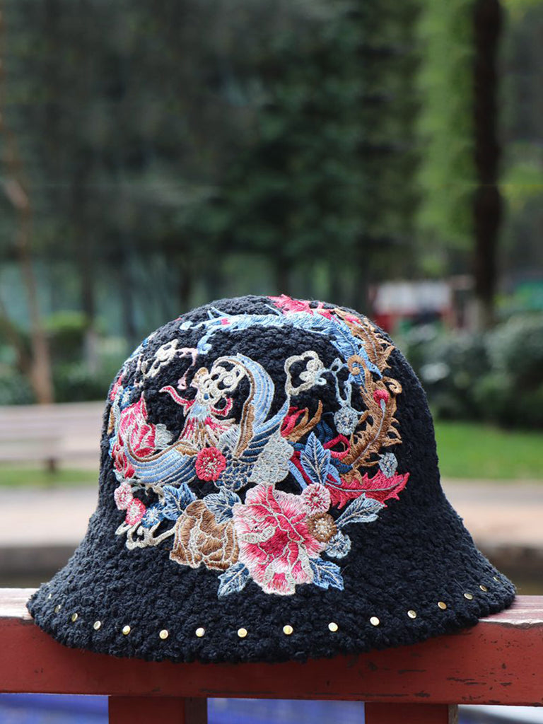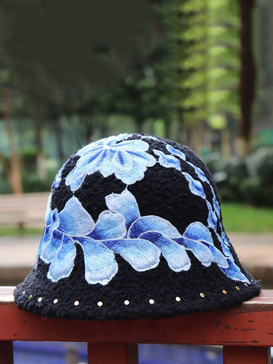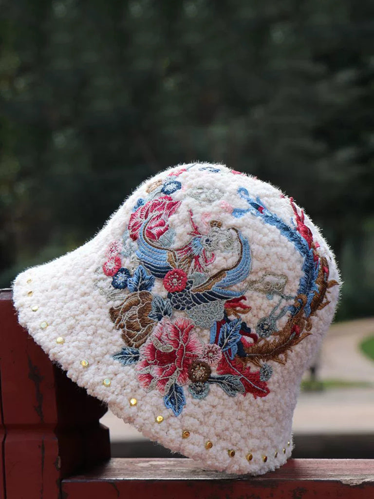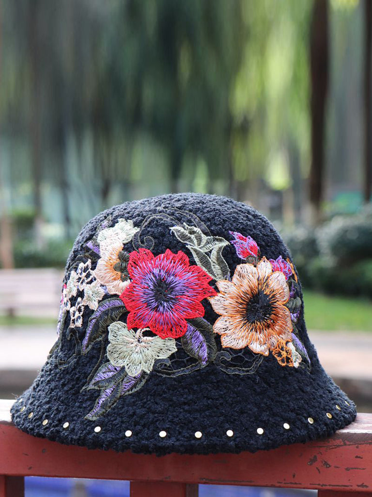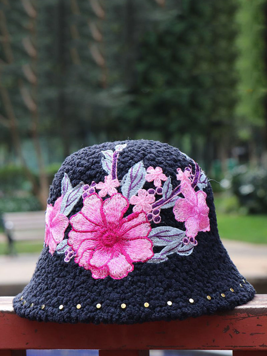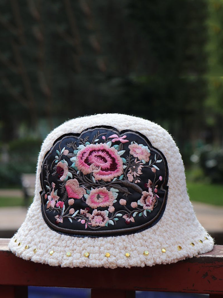 Women Artsy Winter Flower Embroidery Fleece Hat