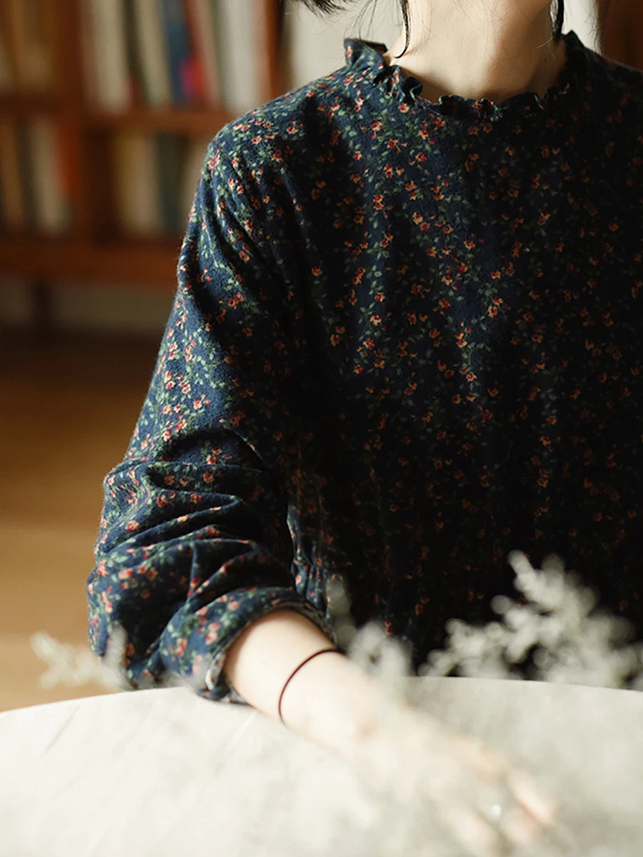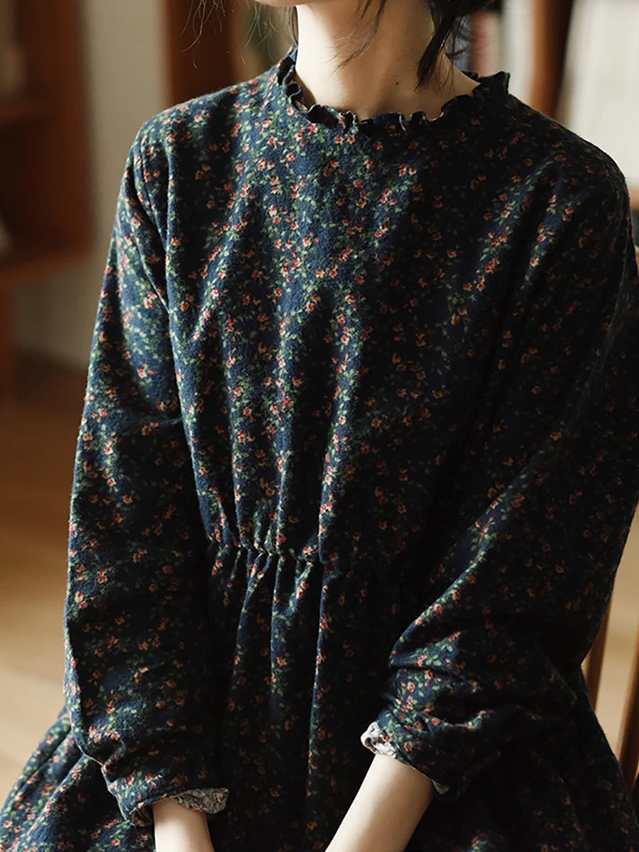 Women Autumn Artsy Floral Stand Collar Cotton Dress