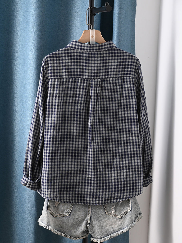 Women Autumn Plaid Turn-down Collar 100%Cotton Shirt