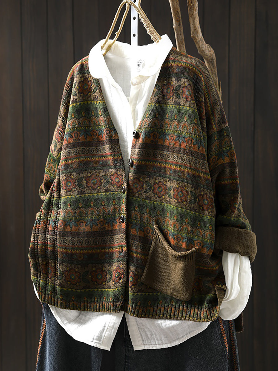 Women Autumn Retro Flower Stripe V-Neck Knitted Sweater