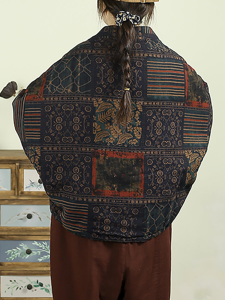 Women Autumn Vintage Flower V-Neck Cotton Padded Coat