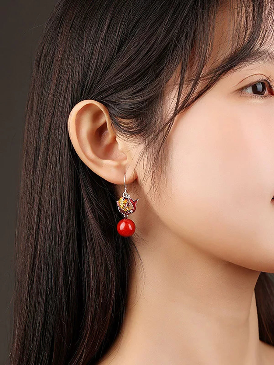Women Ethnic Cloisonne Fish Red Bead Earrings