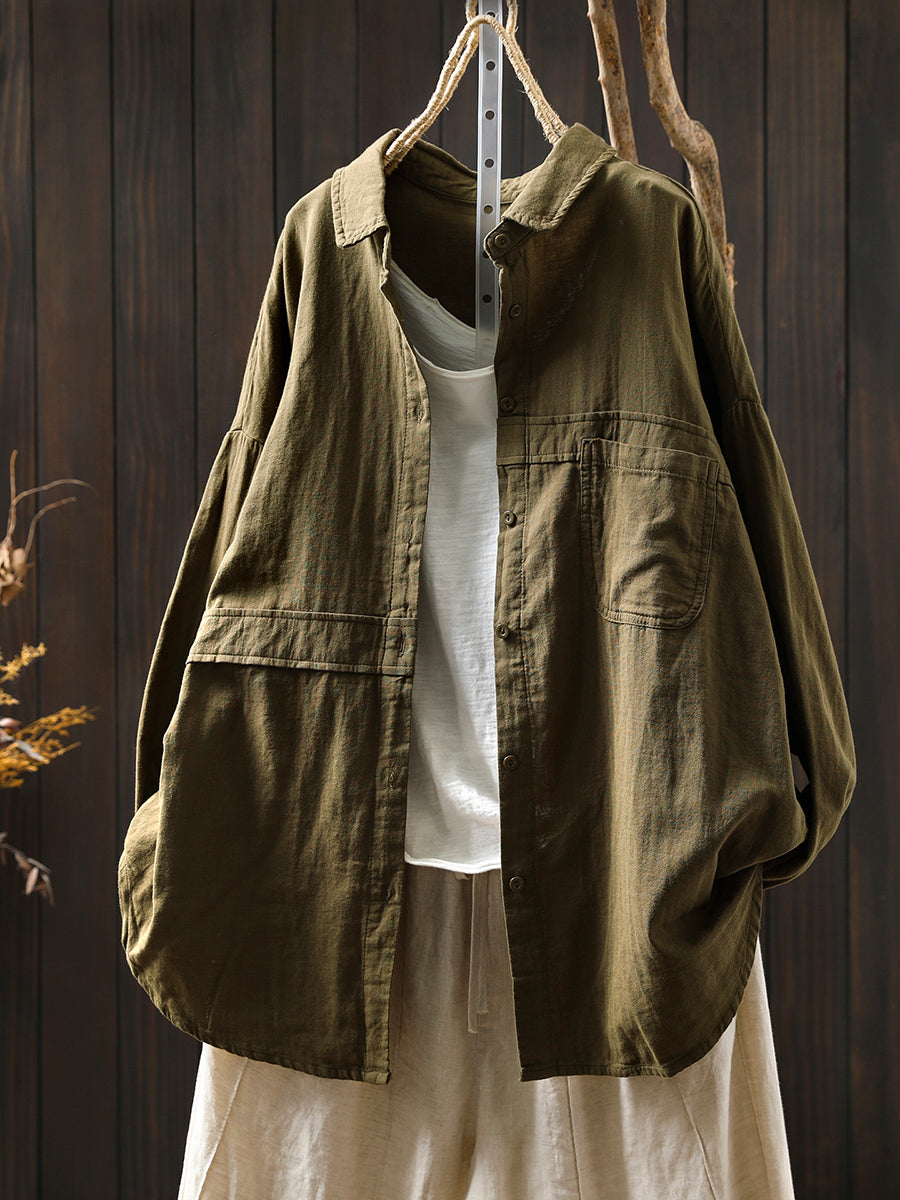 Women Pure Color Turn-down Collar 100%Cotton Shirt
