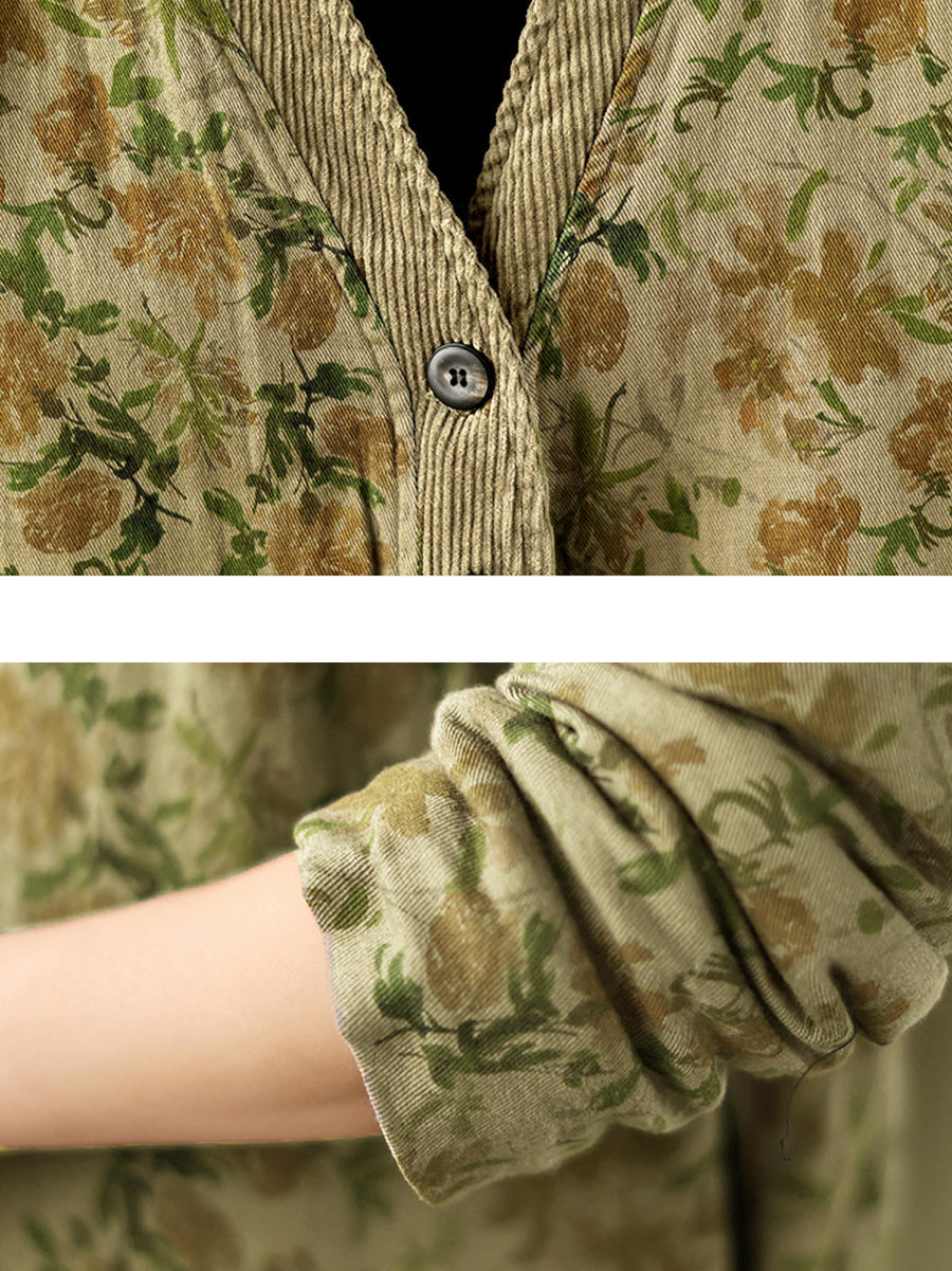 Plus Size Women Retro Floral Spliced V-Neck Padded Jacket