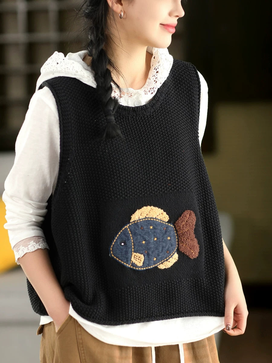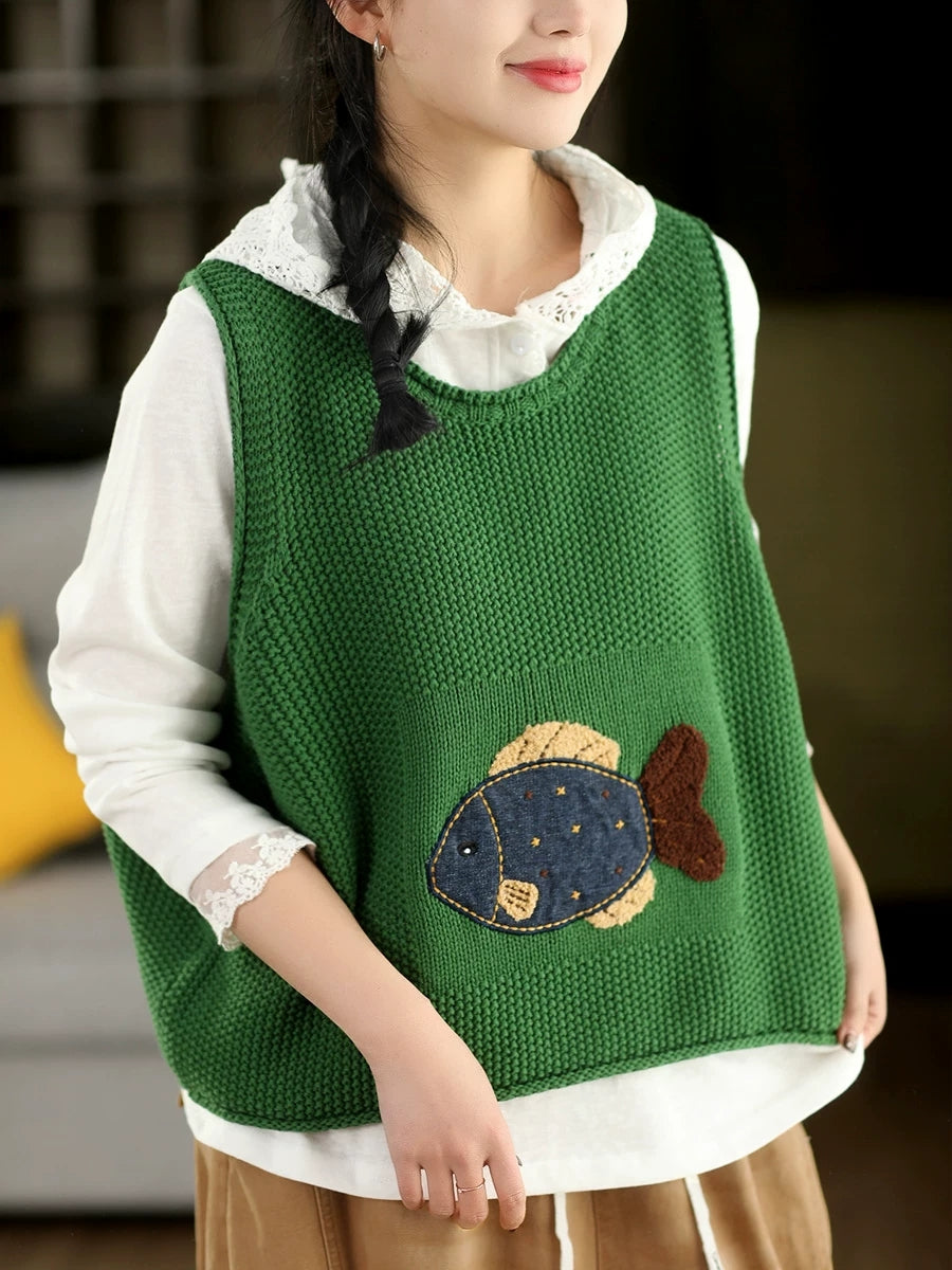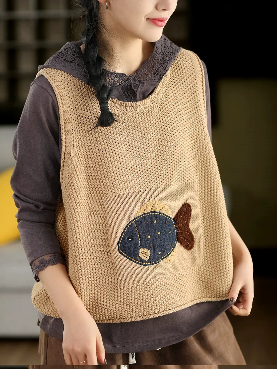 Women Spring Artsy Fish Patch O-Neck Vest