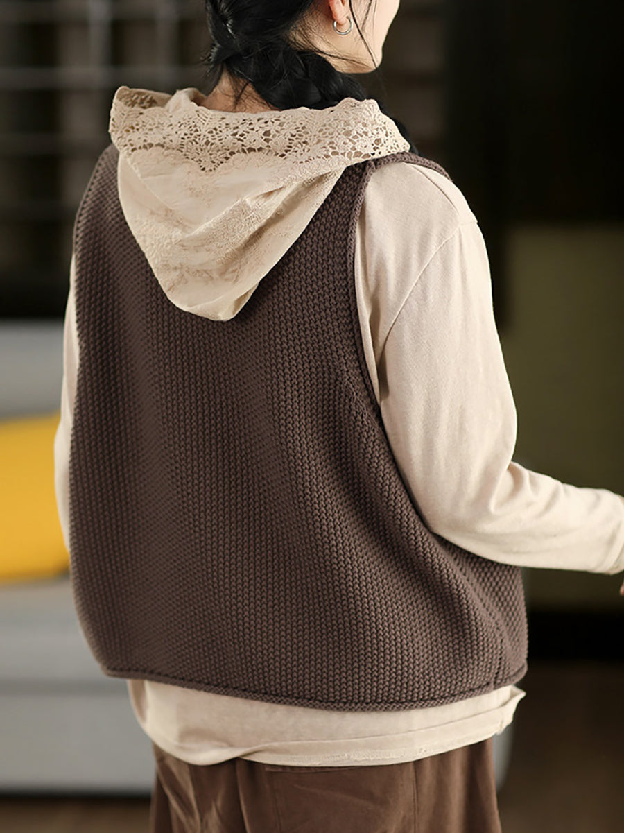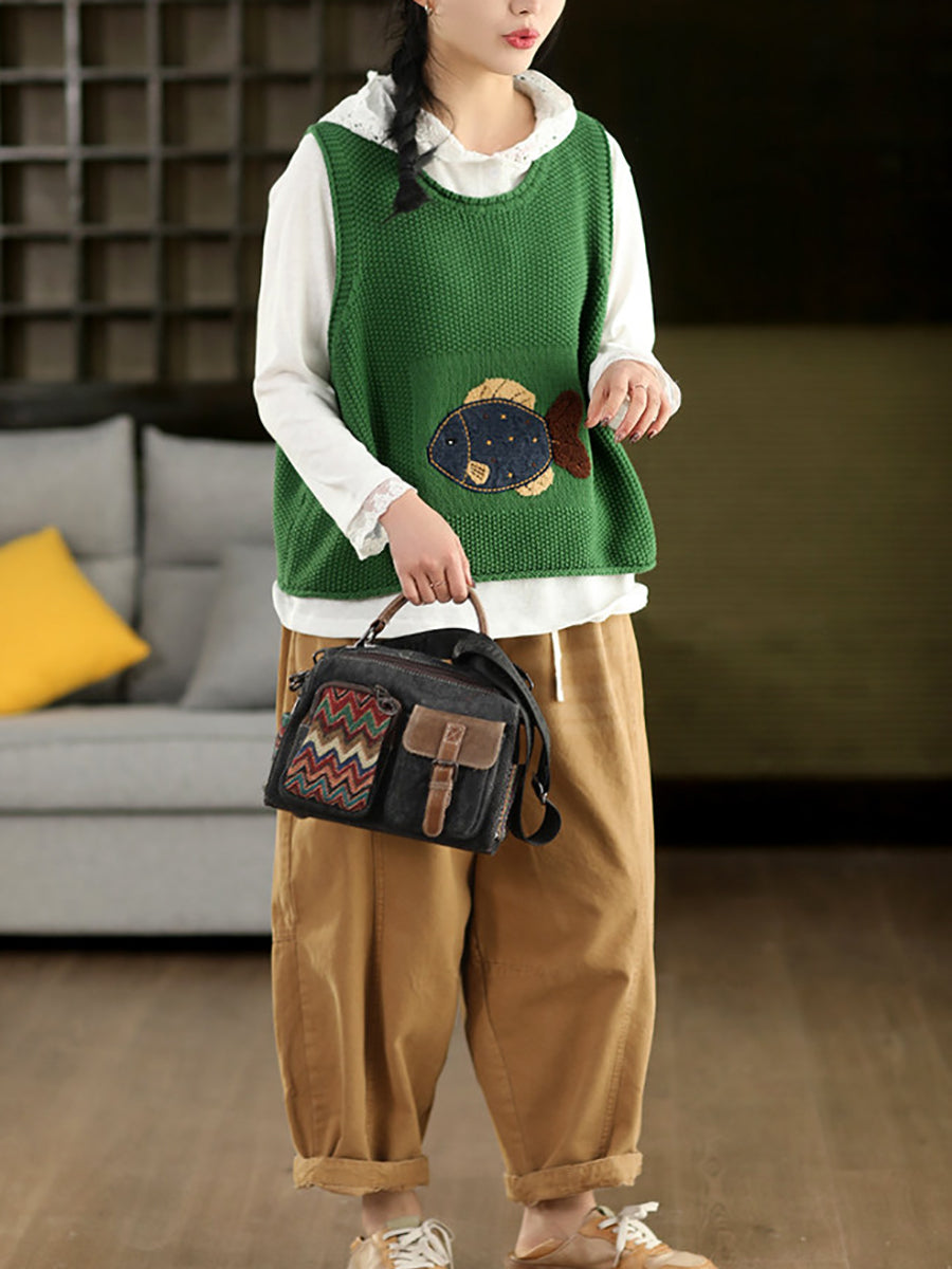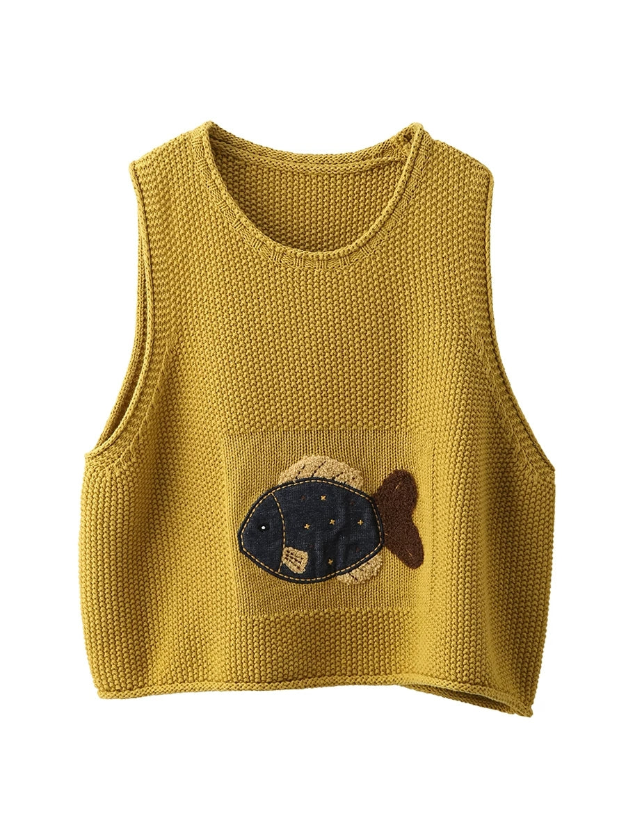 Women Spring Artsy Fish Patch O-Neck Vest