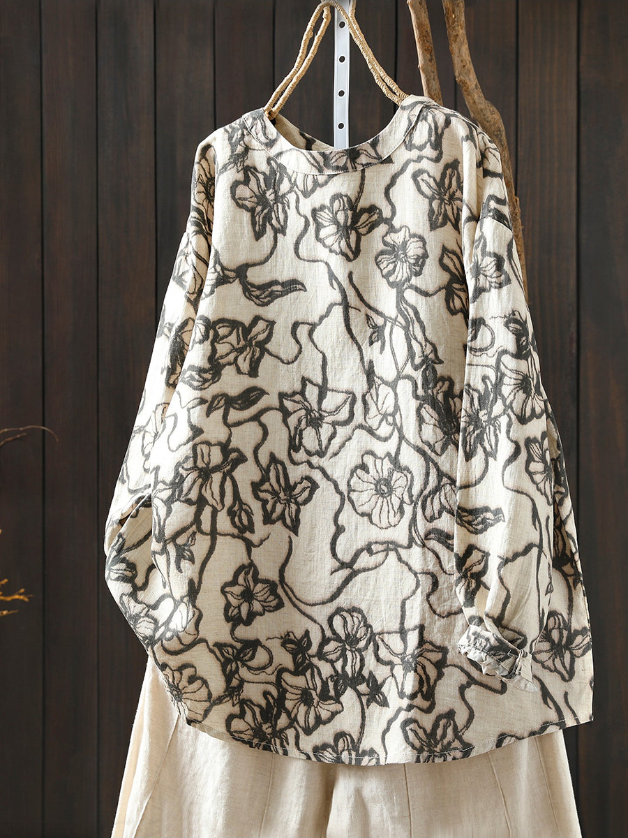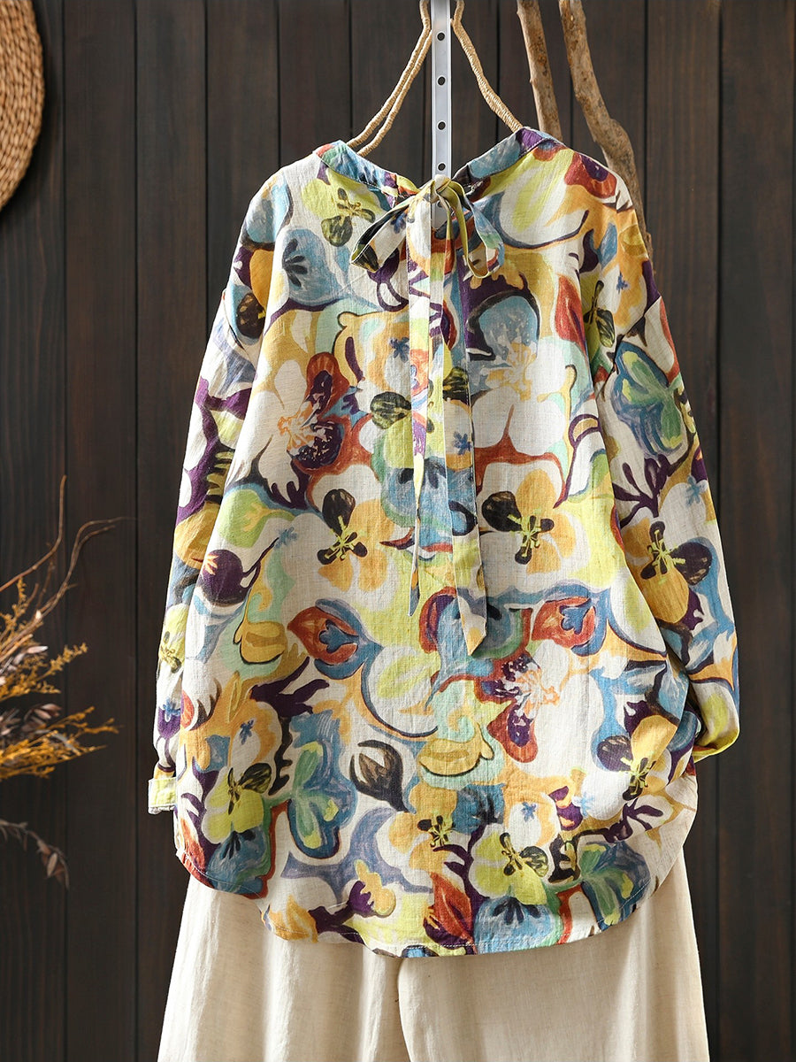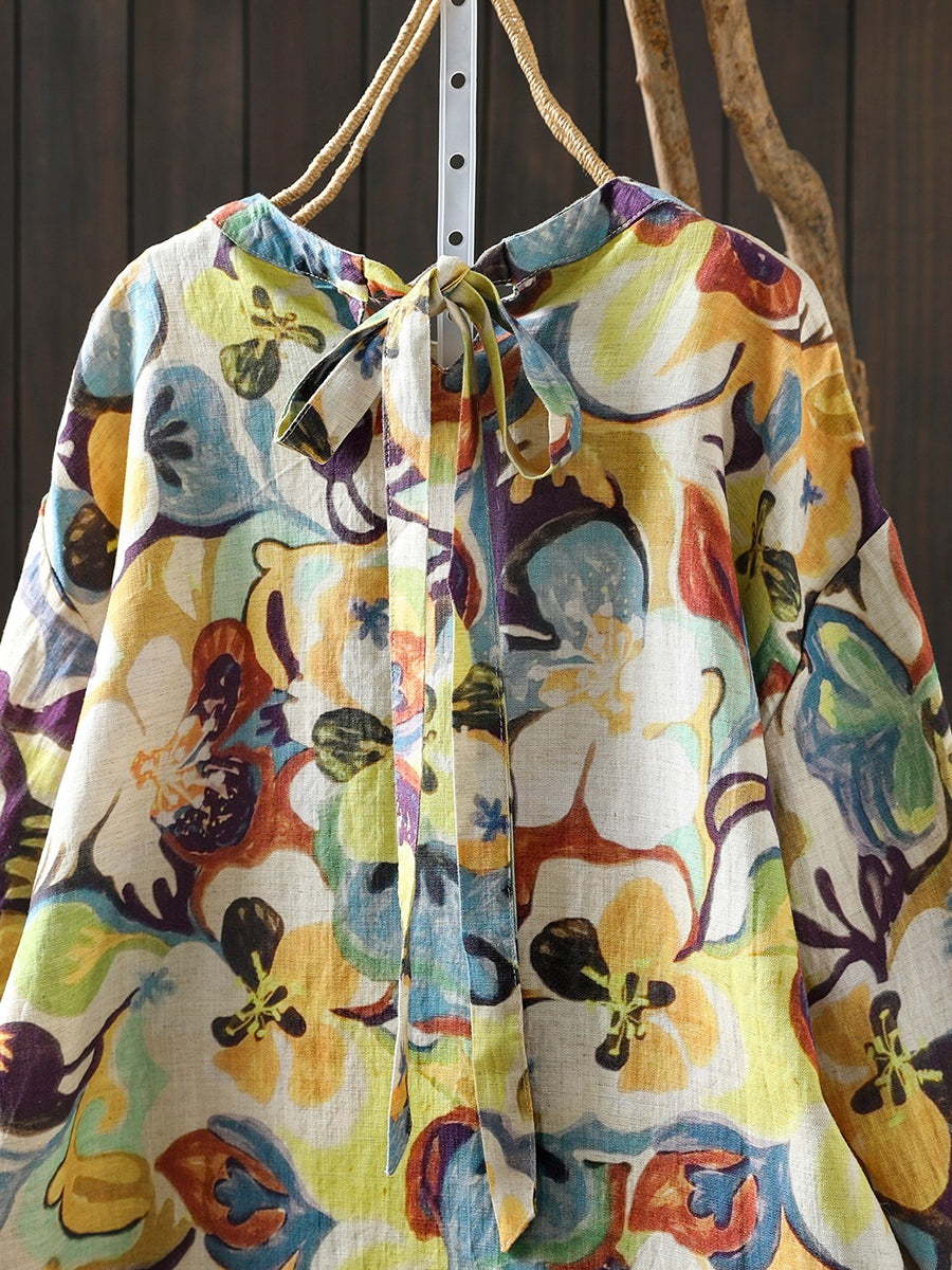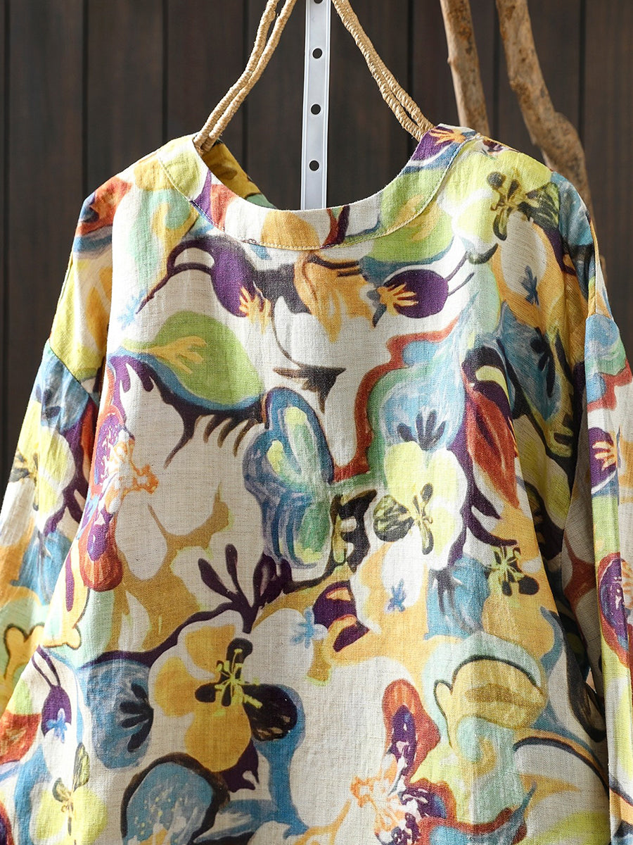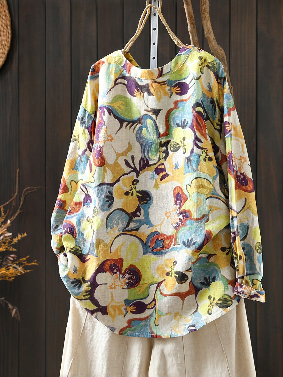 Women Spring Artsy Flower 100%Linen Blouse