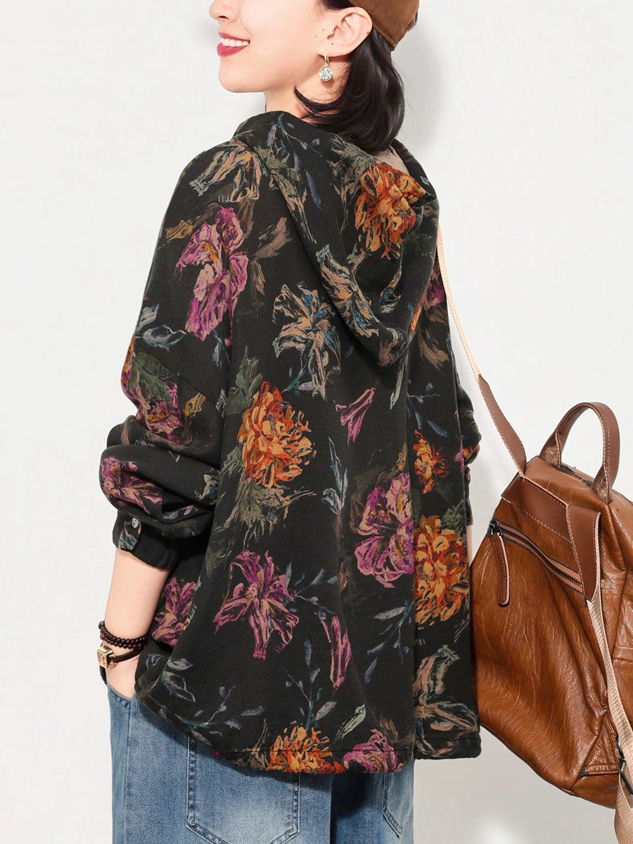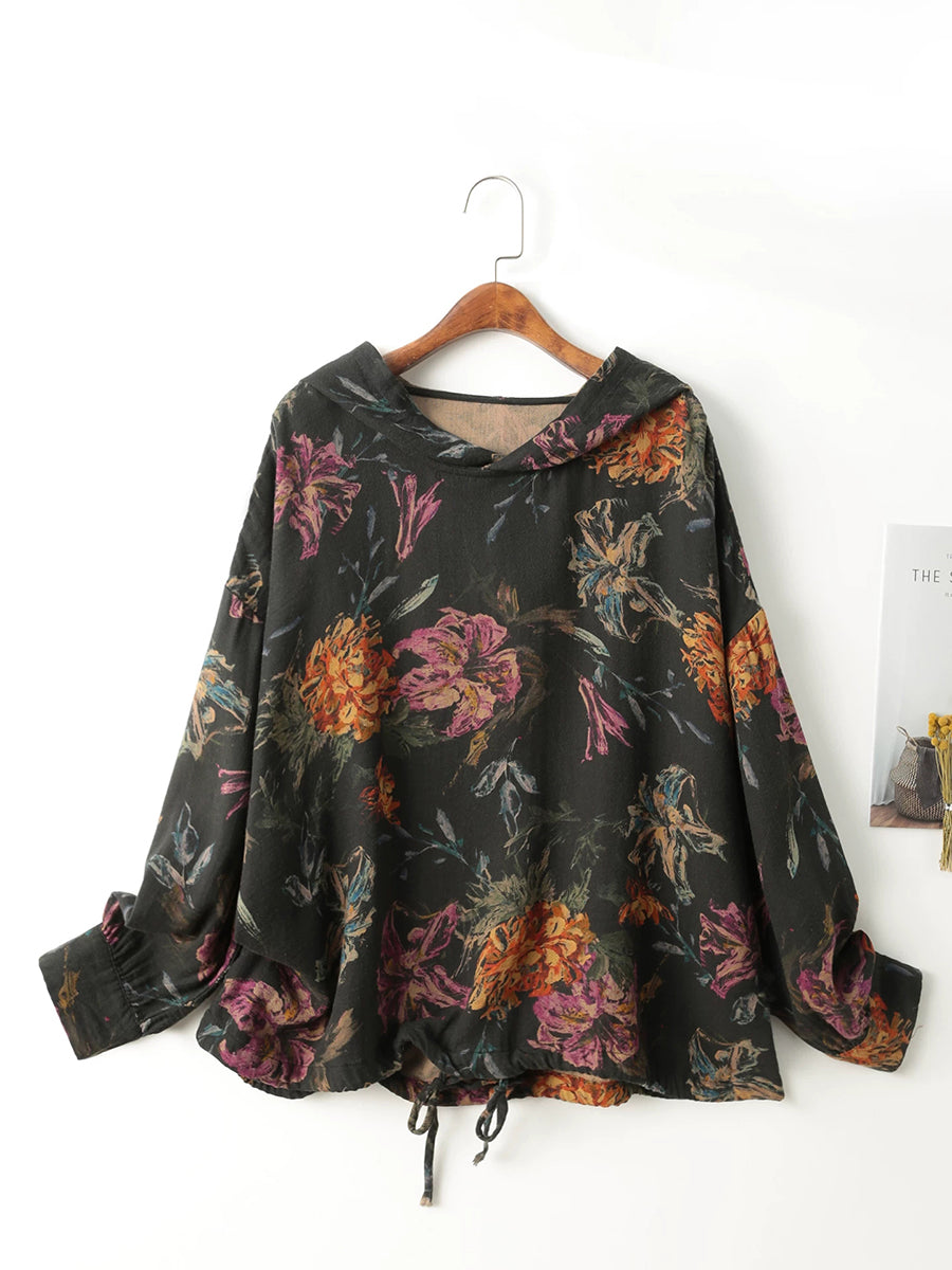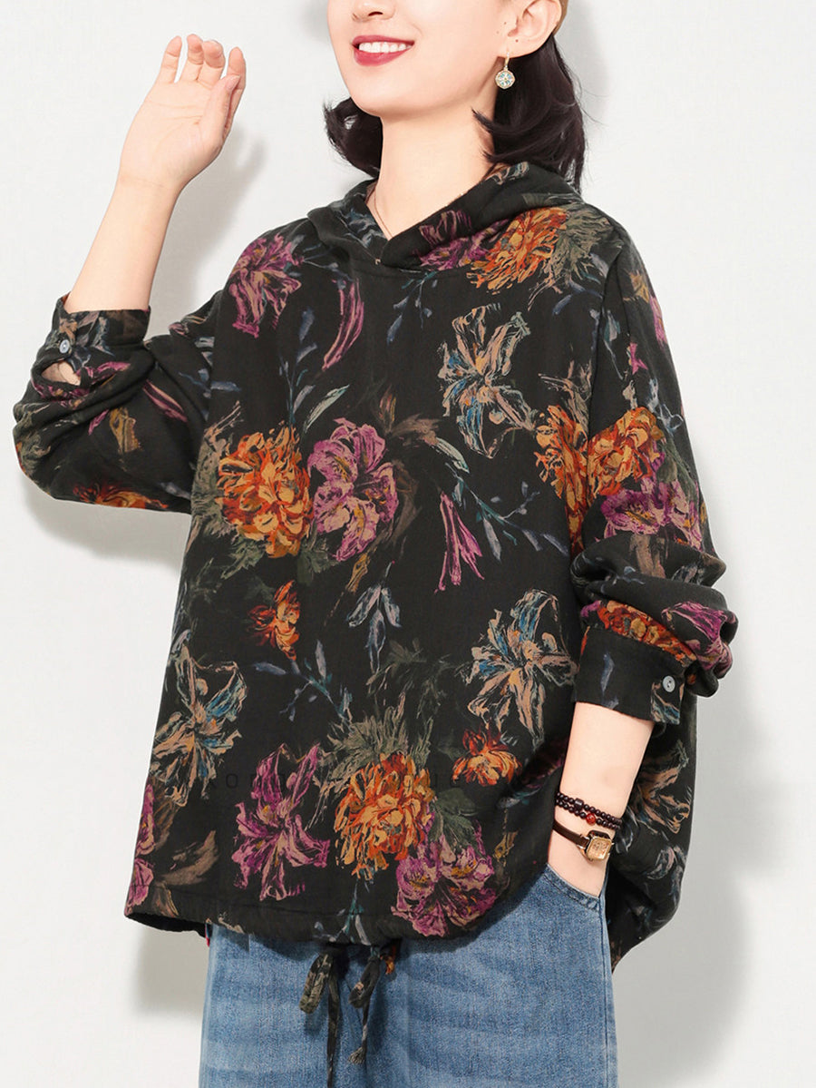 Women Spring Artsy Flower Cotton Hoodie