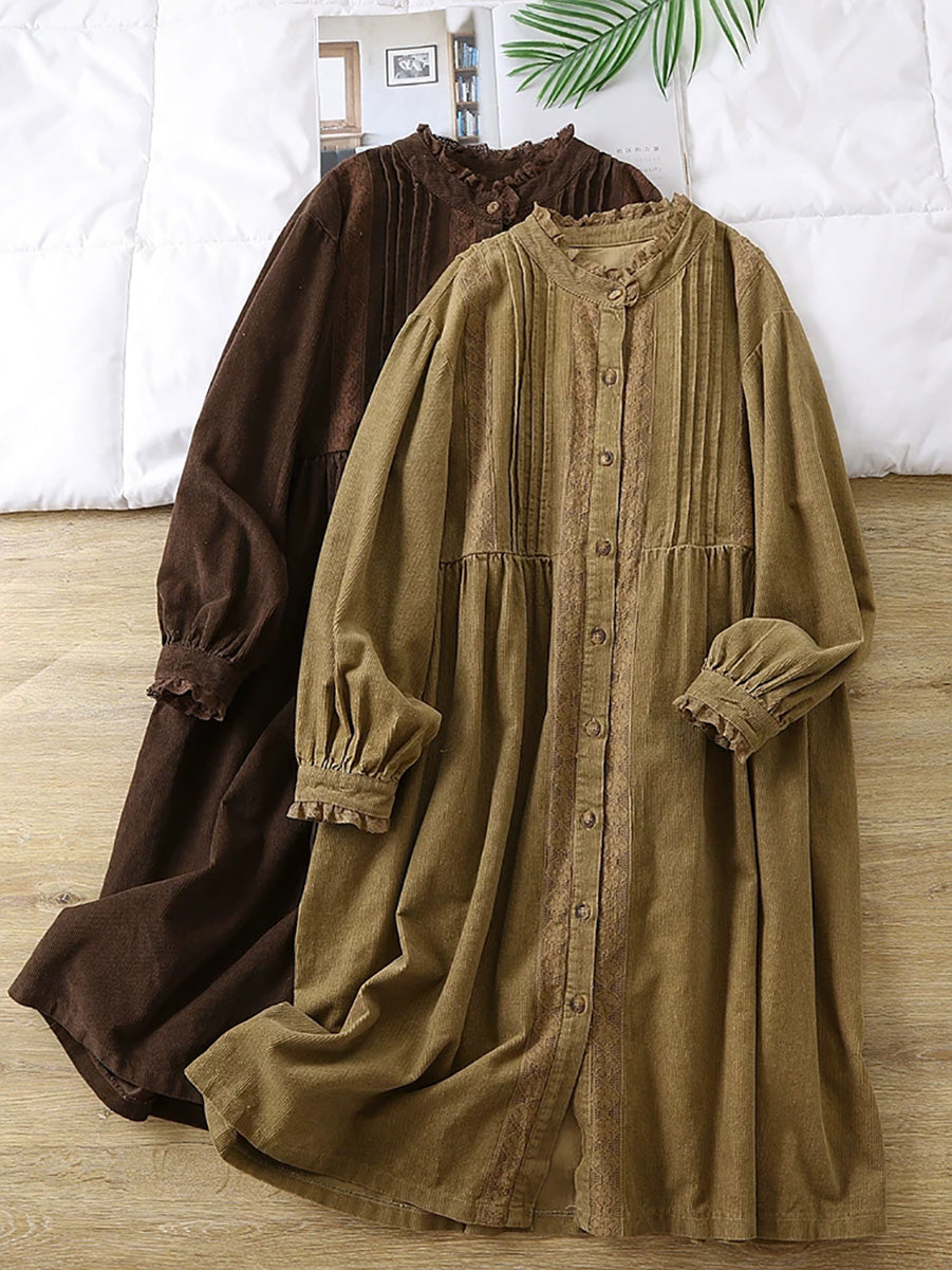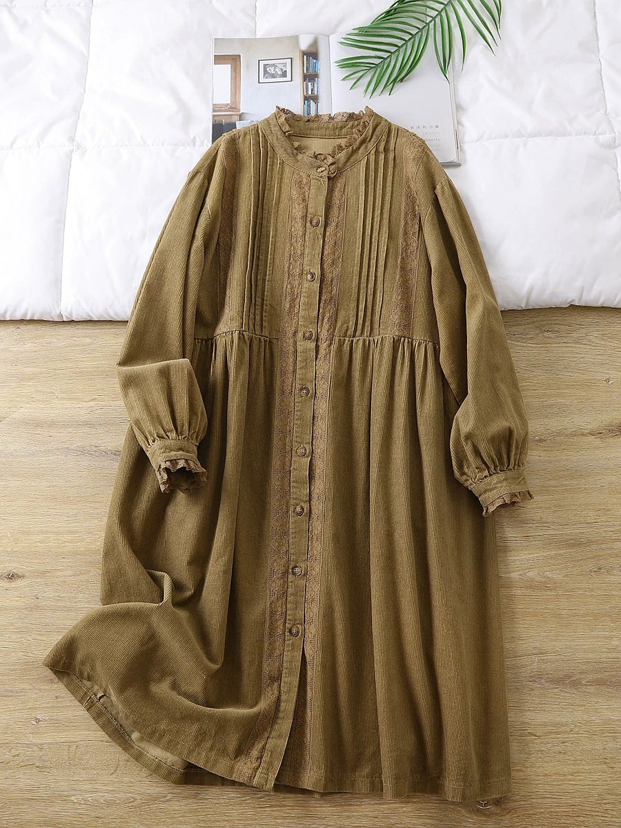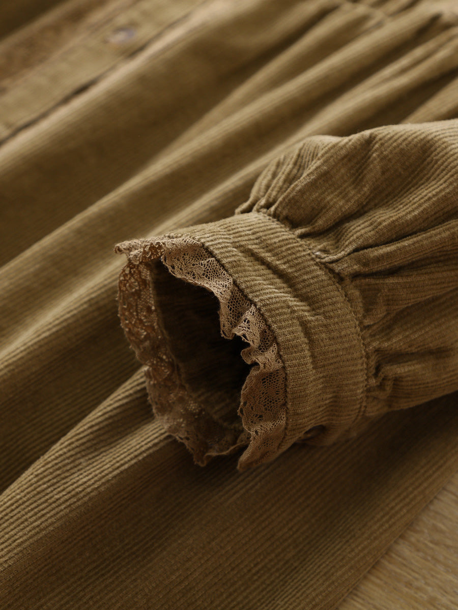 Women Spring Artsy Lace Shirred Corduroy Dress