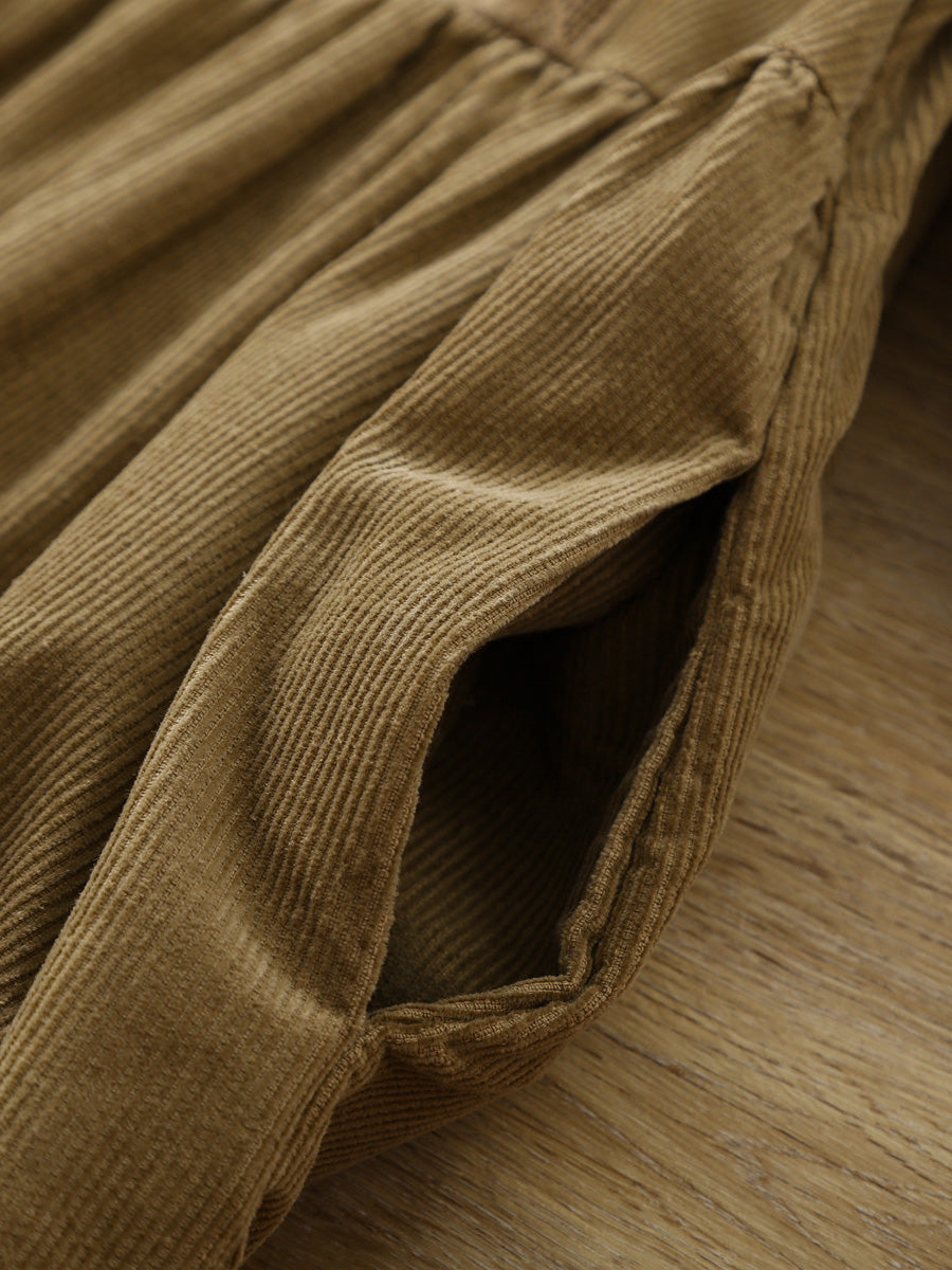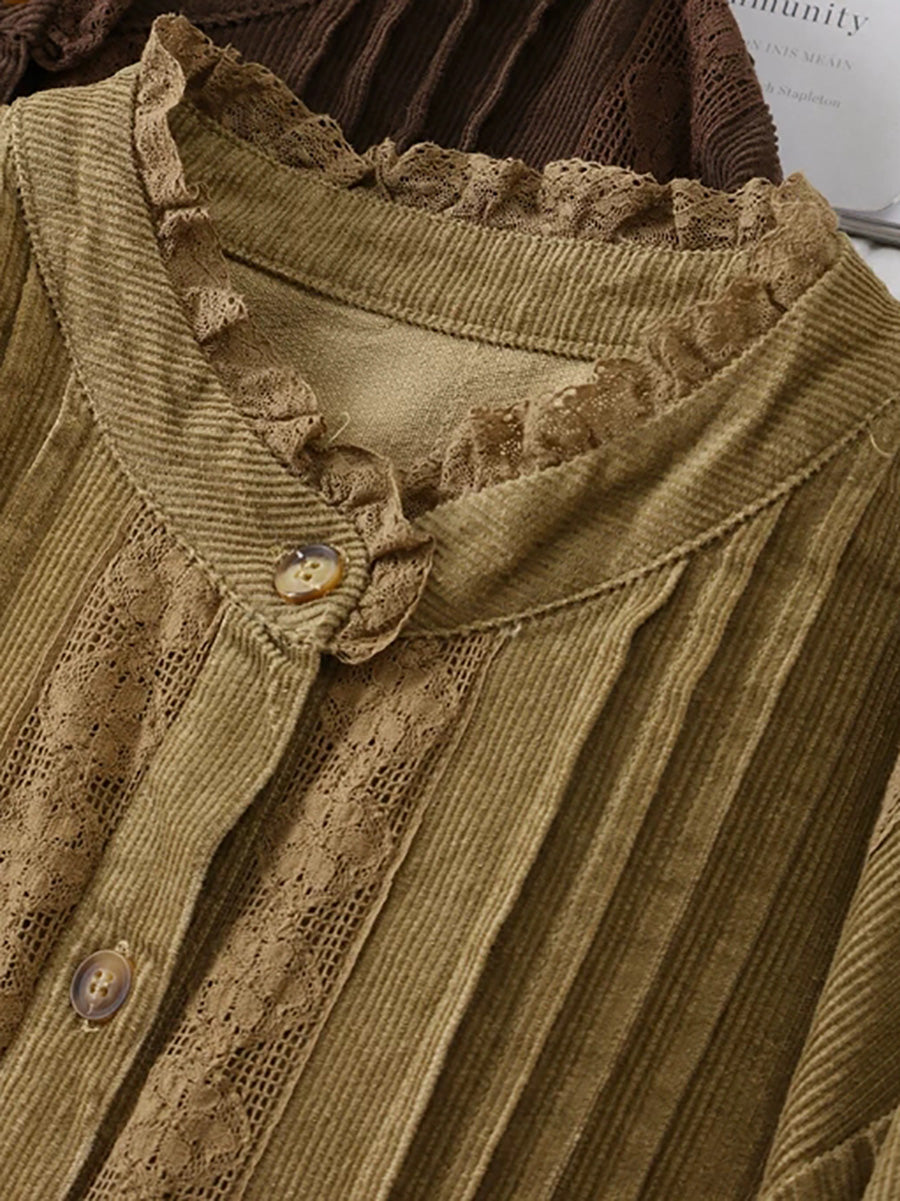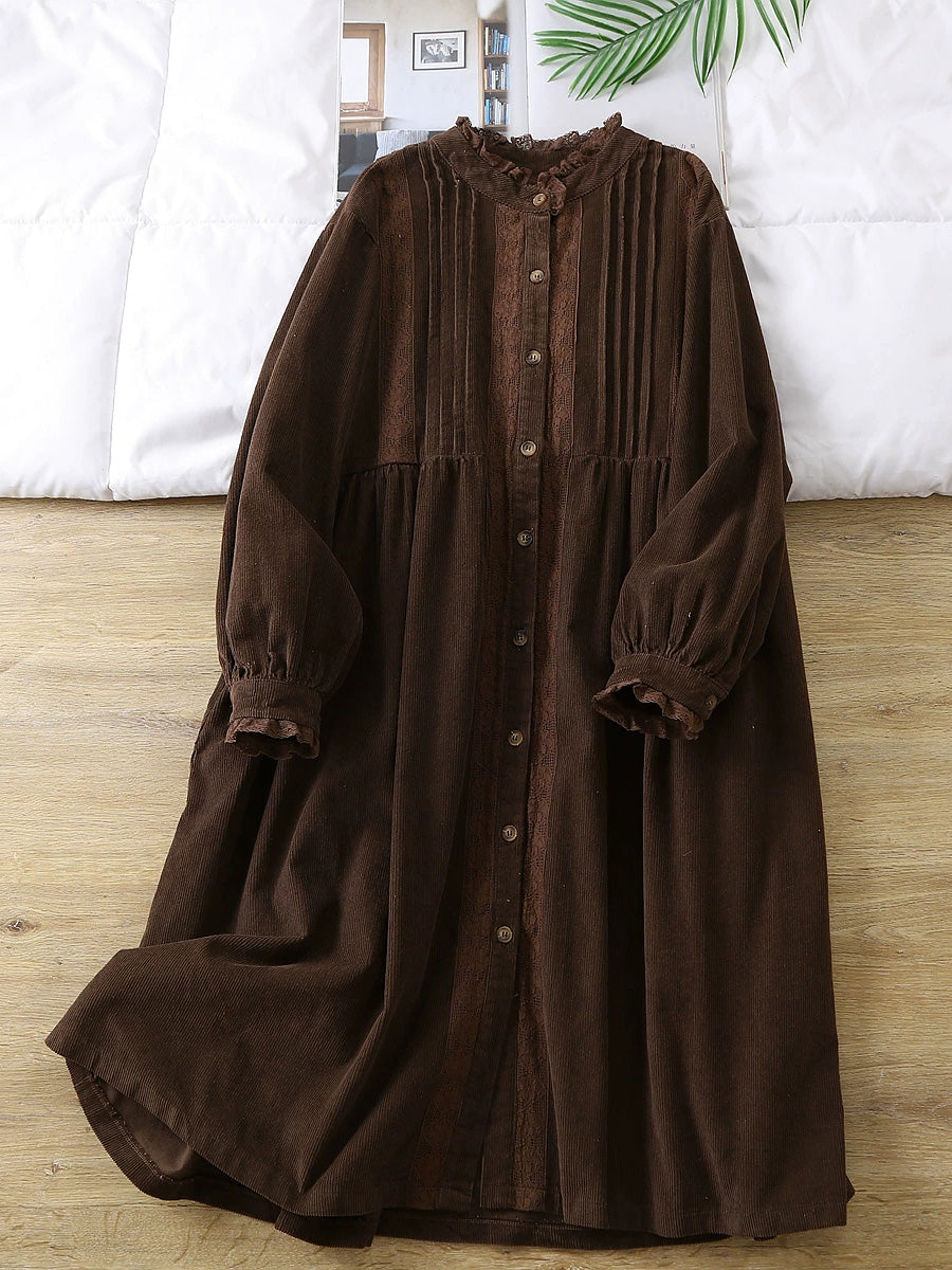 Women Spring Artsy Lace Shirred Corduroy Dress