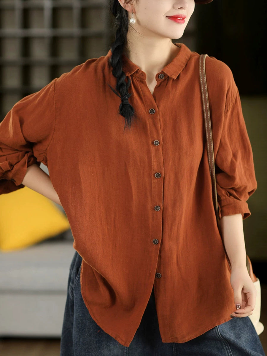 Women Spring Artsy Pure Color 100%Linen Turn-down Collar Shirt