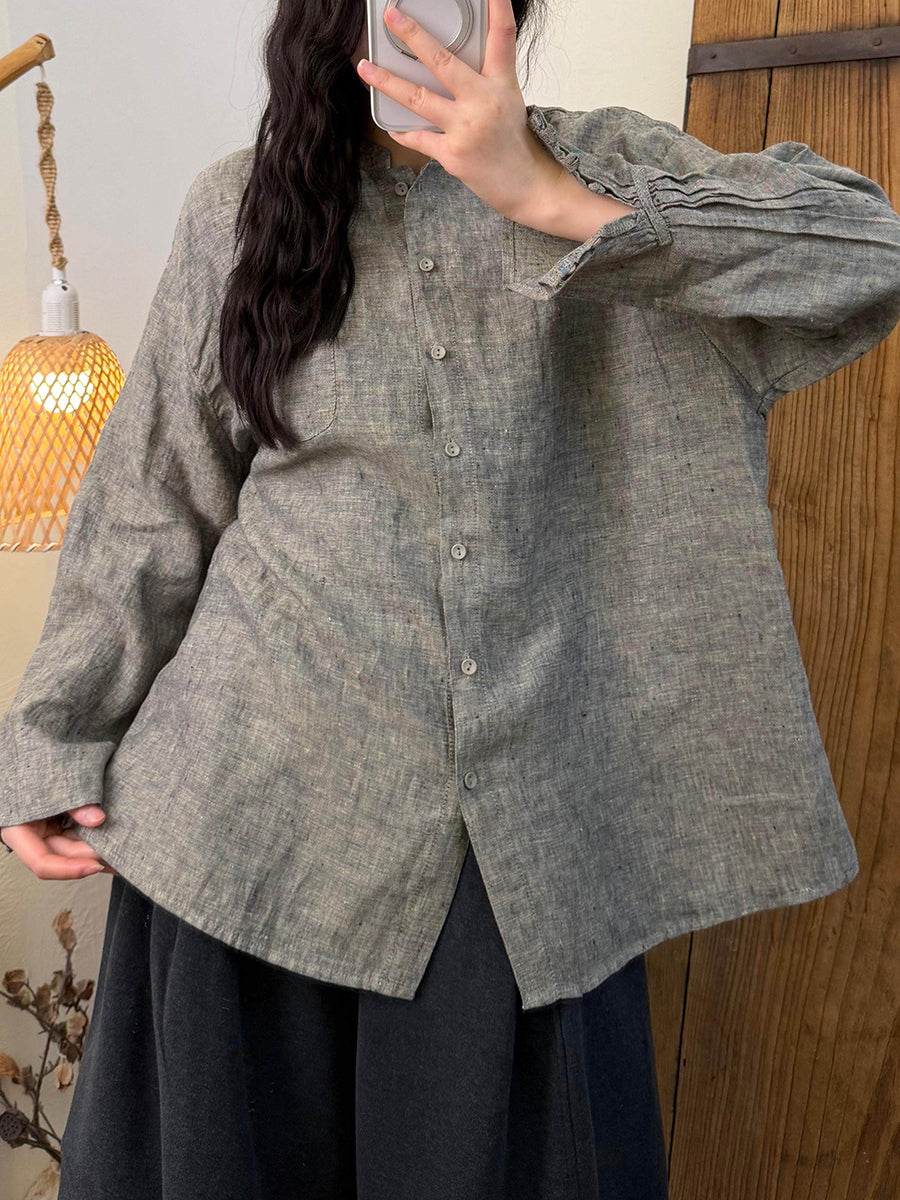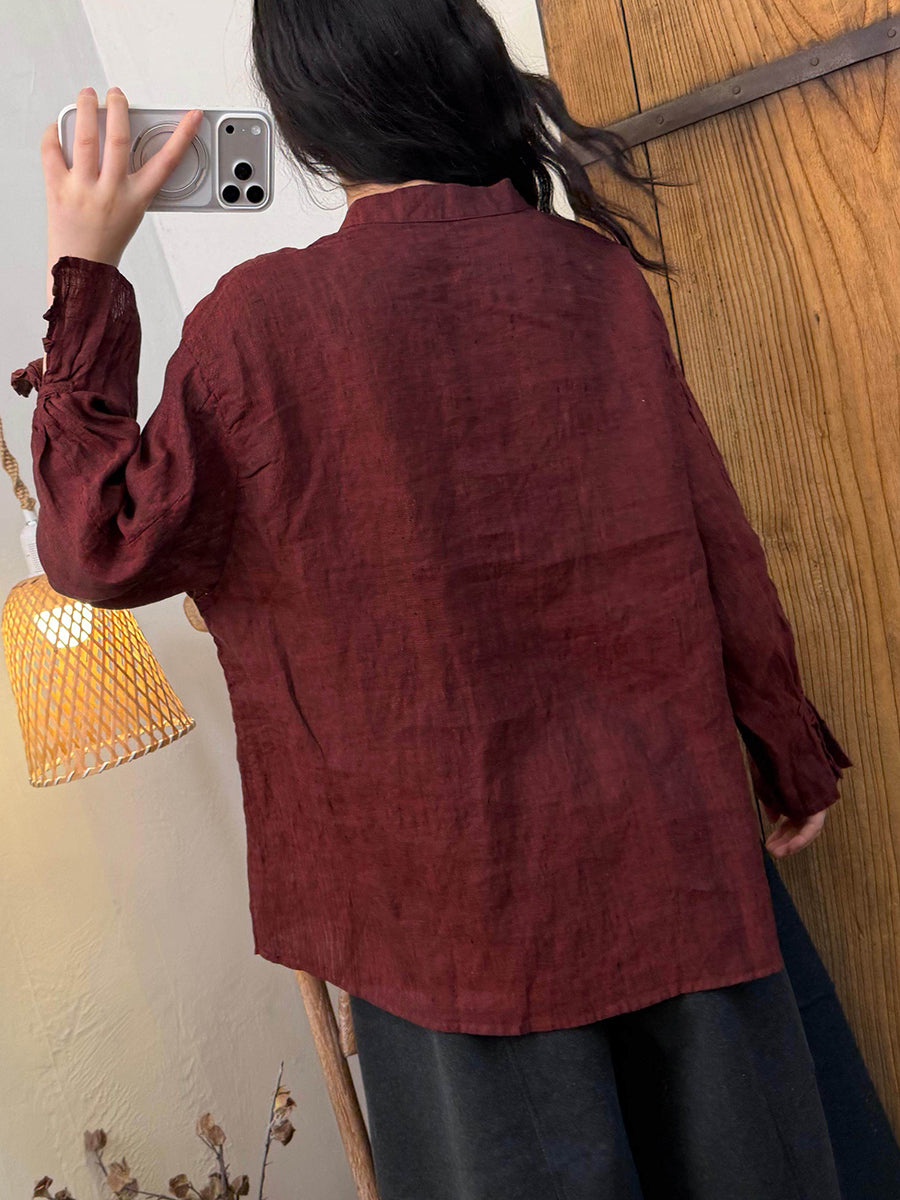 Women Spring Artsy Pure Color Linen Stand Collar Shirt