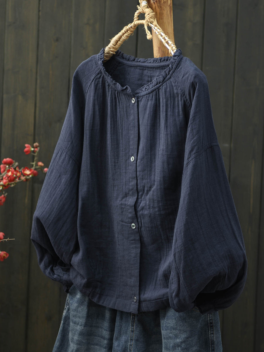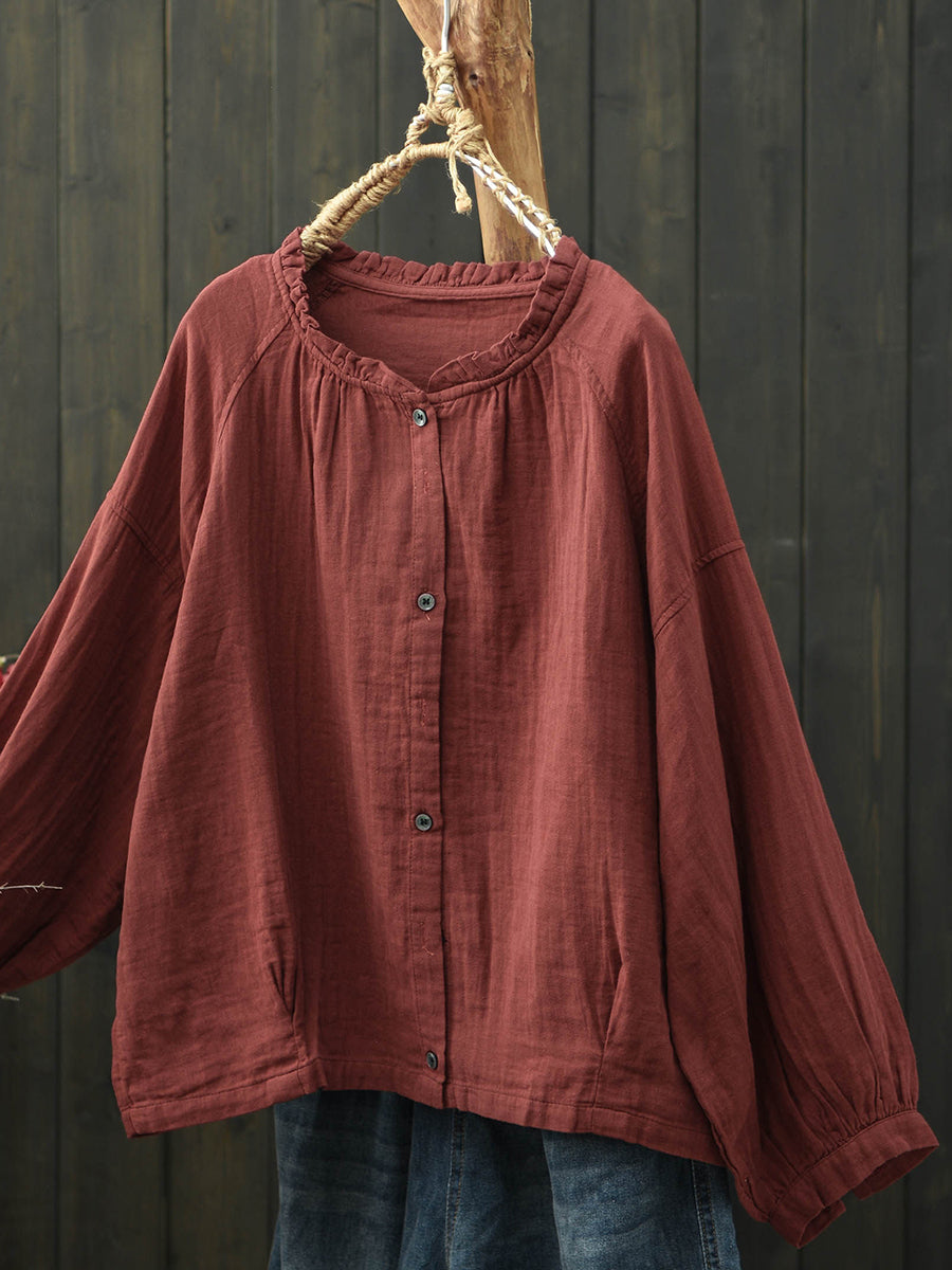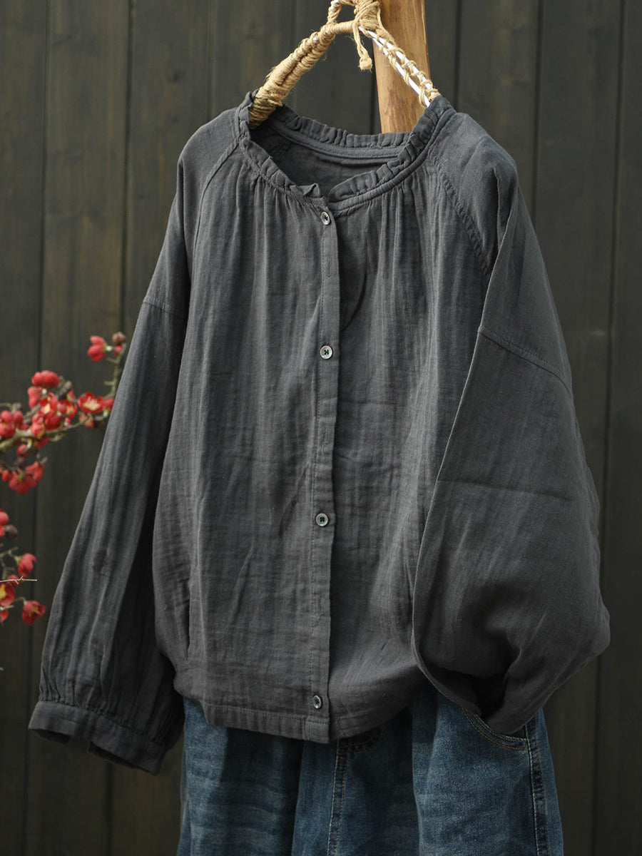 Women Spring Artsy Pure Color Stand Collar Cotton Shirt