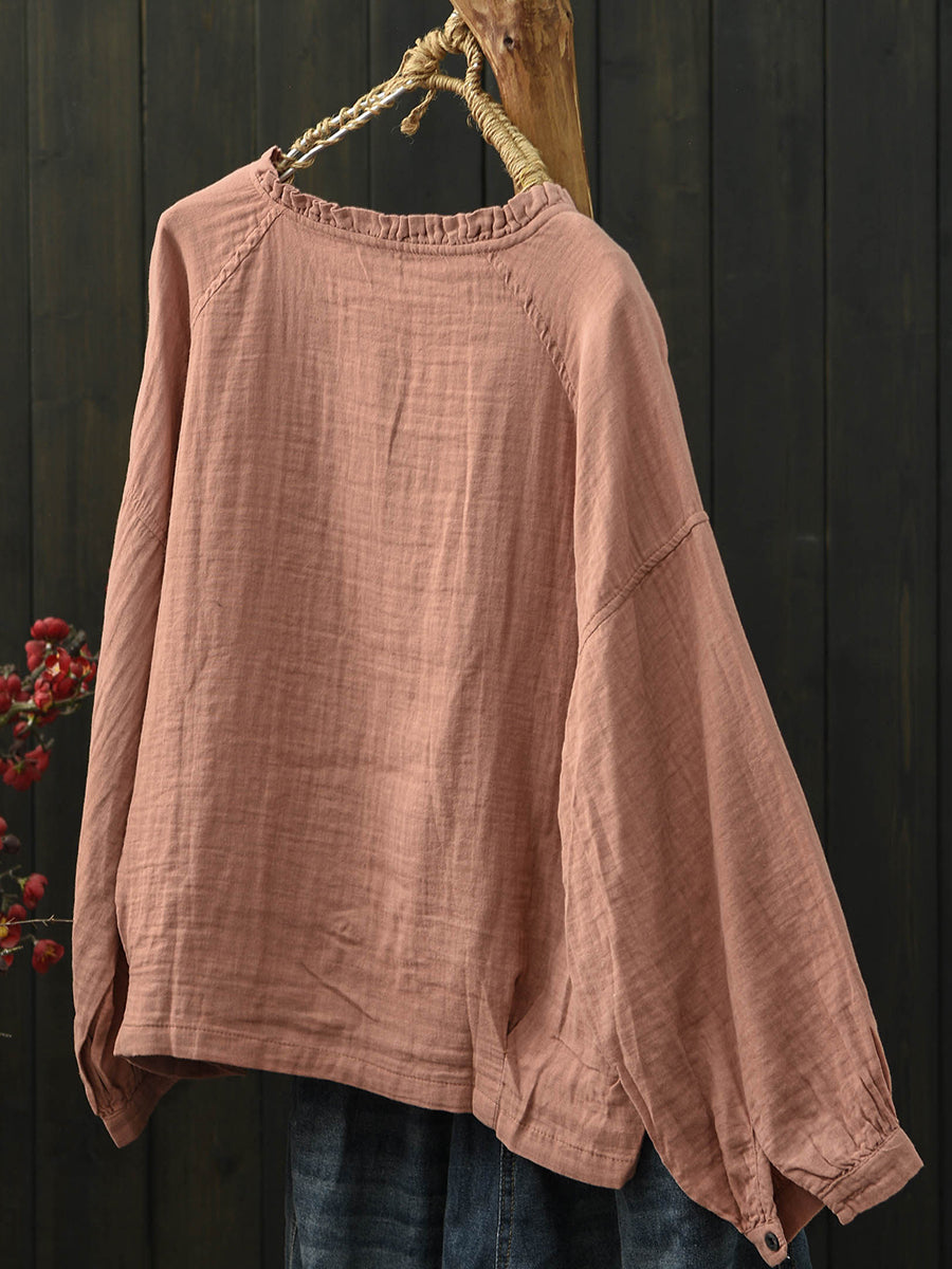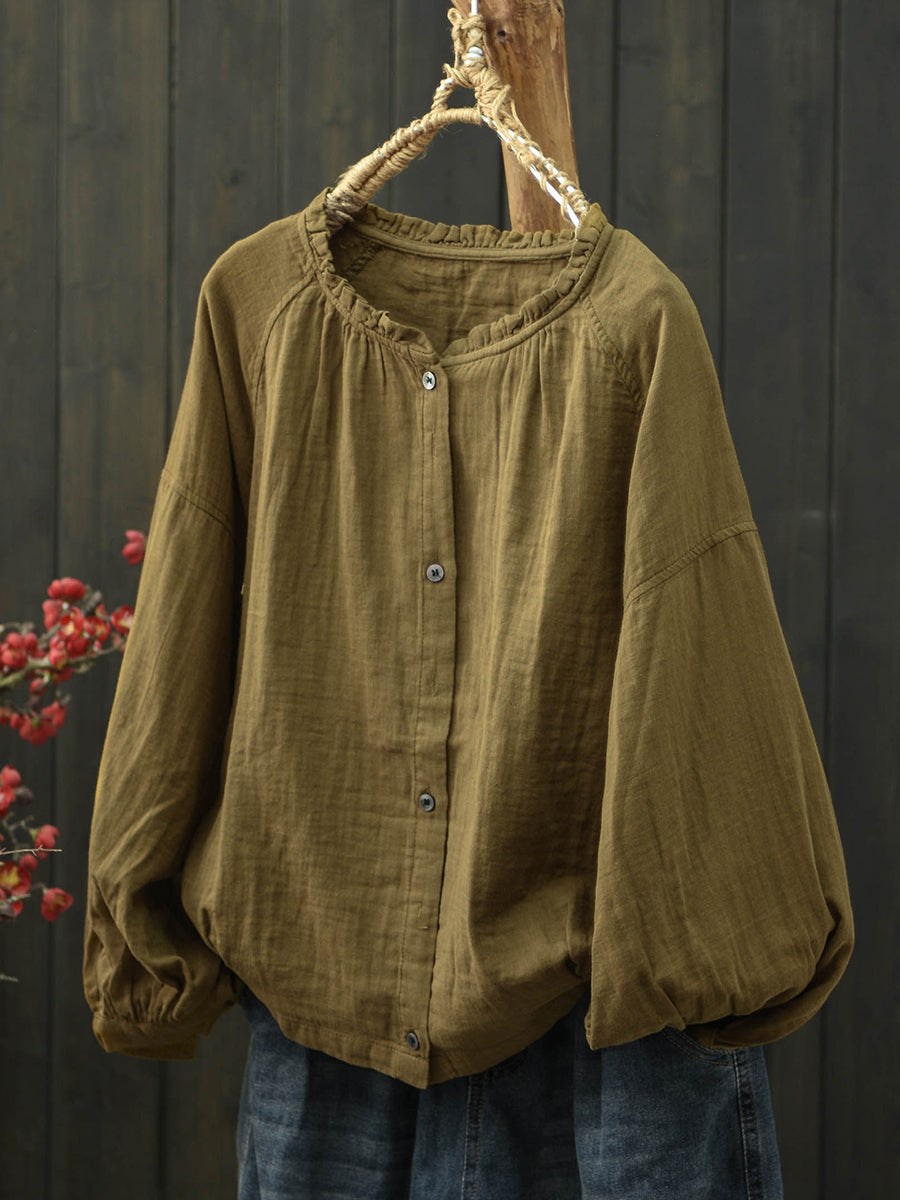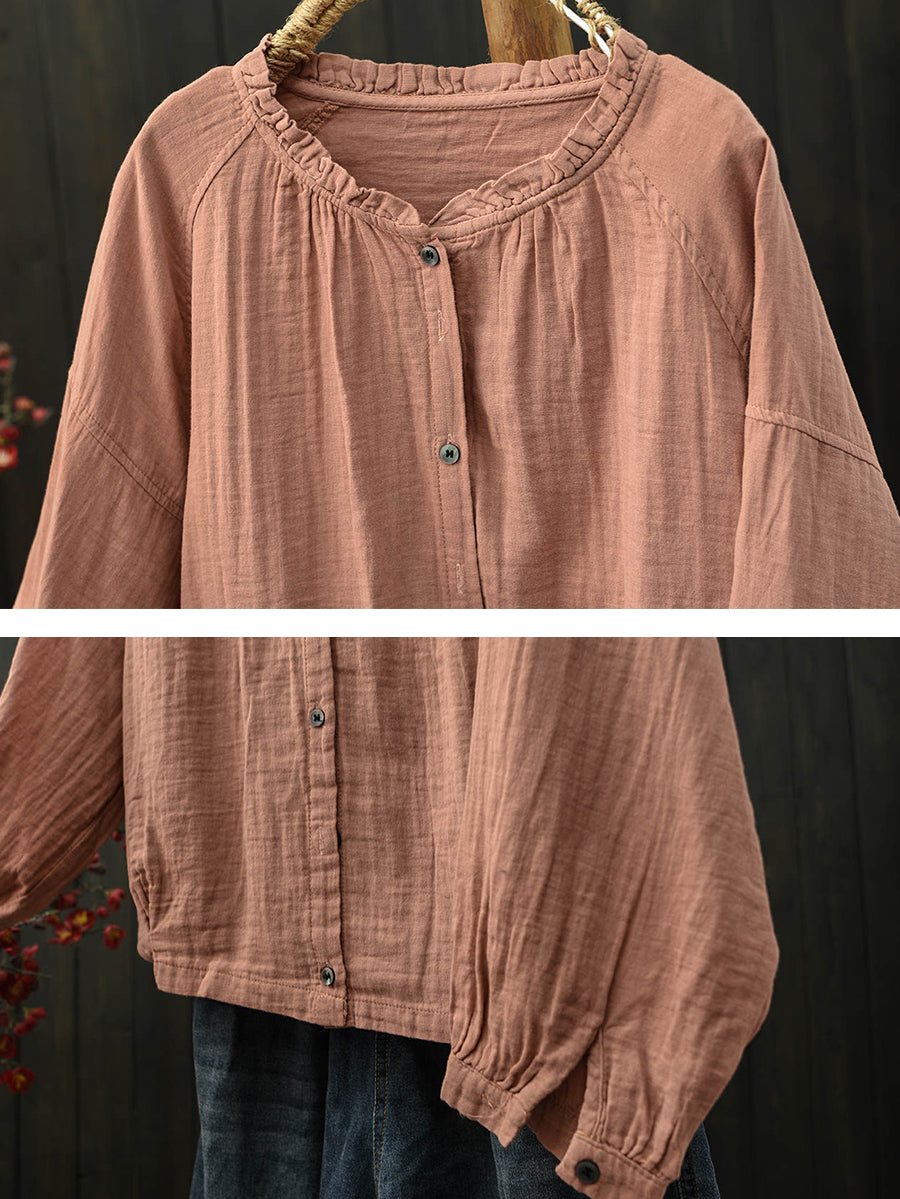 Women Spring Artsy Pure Color Stand Collar Cotton Shirt
