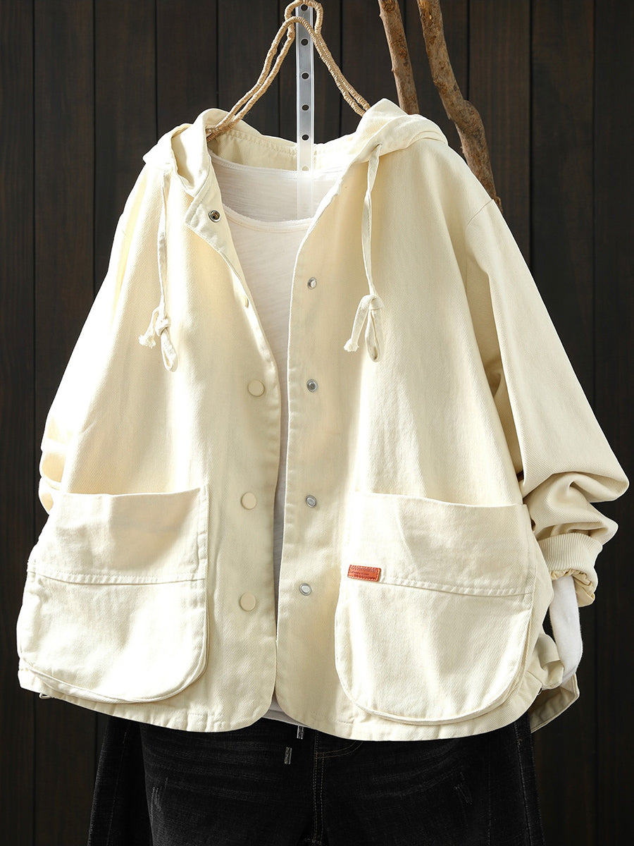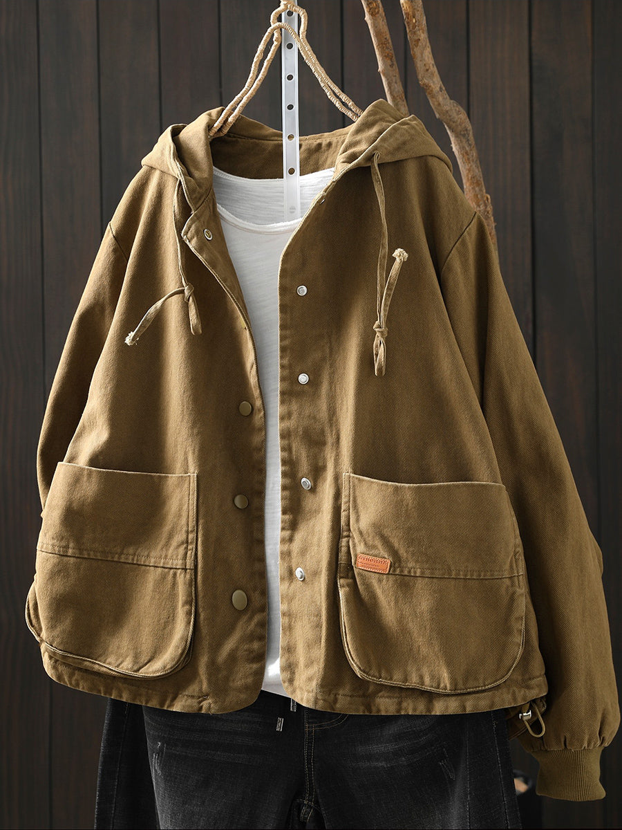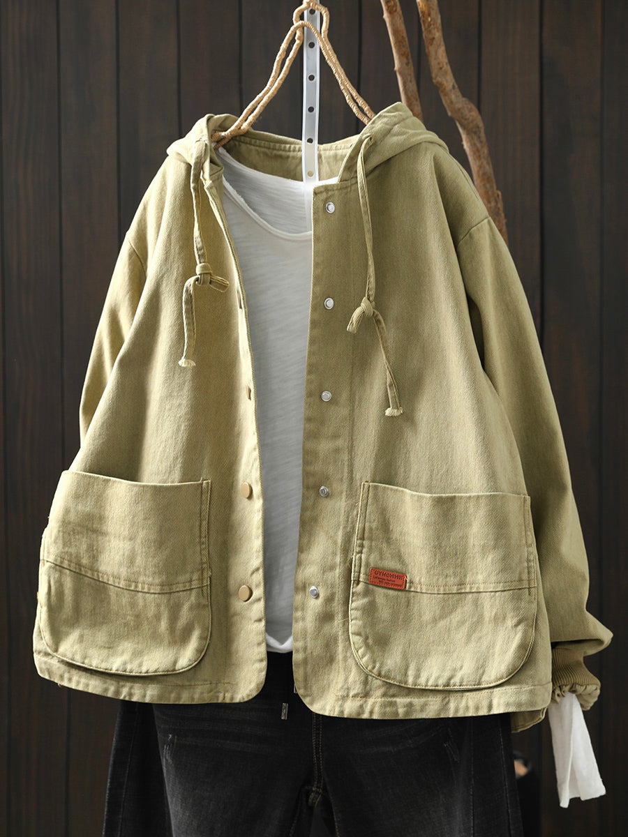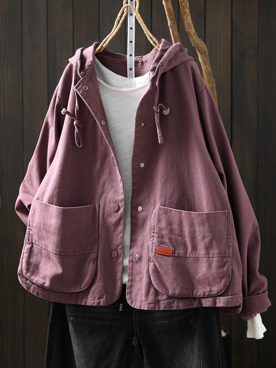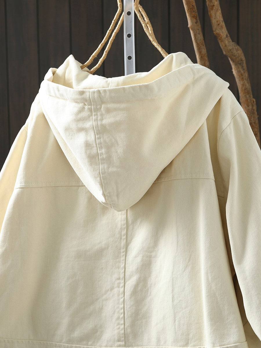 Women Spring Casual Pure Color Hooded Cotton Coat