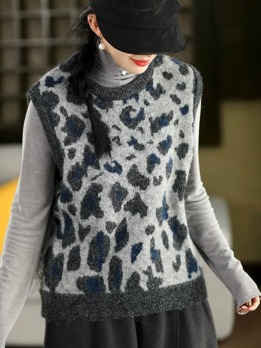 Women Spring Fashion Leopard Jacquard O-Neck Knitted Vest