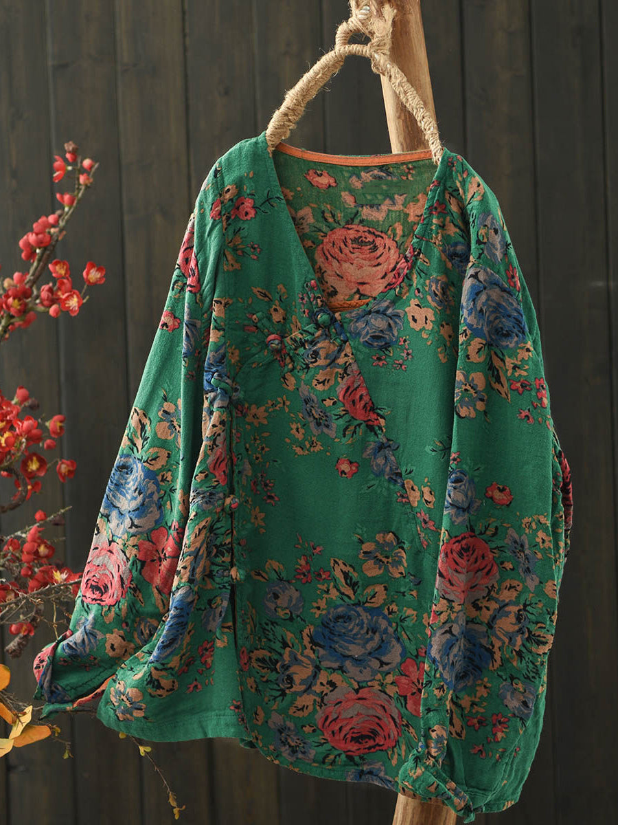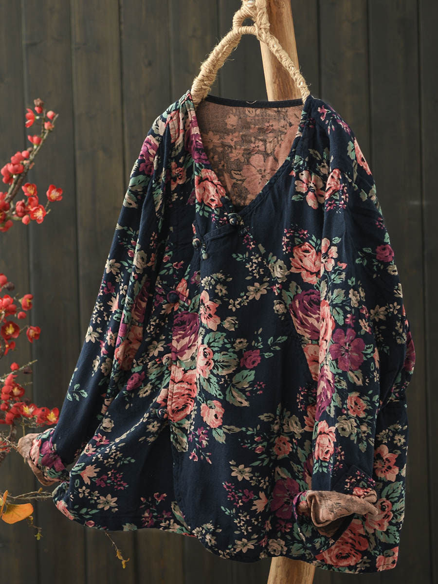 Women Spring Retro Flower V-Neck Cotton Blouse