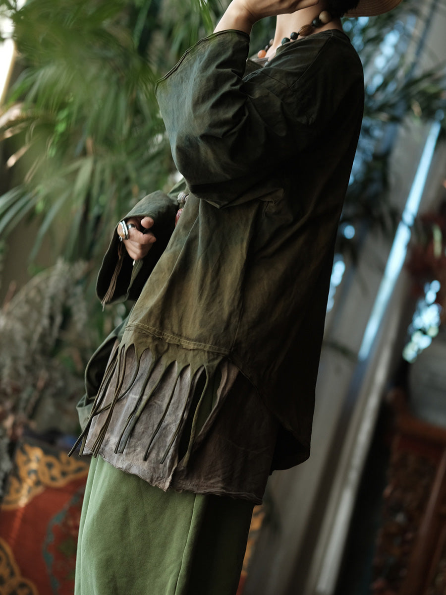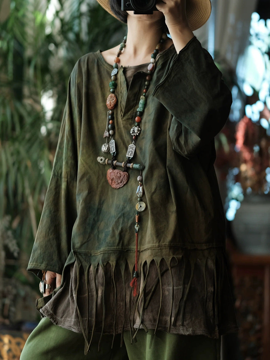 Women Spring Retro Tie-dye Tassel Spliced O-Neck Blouse