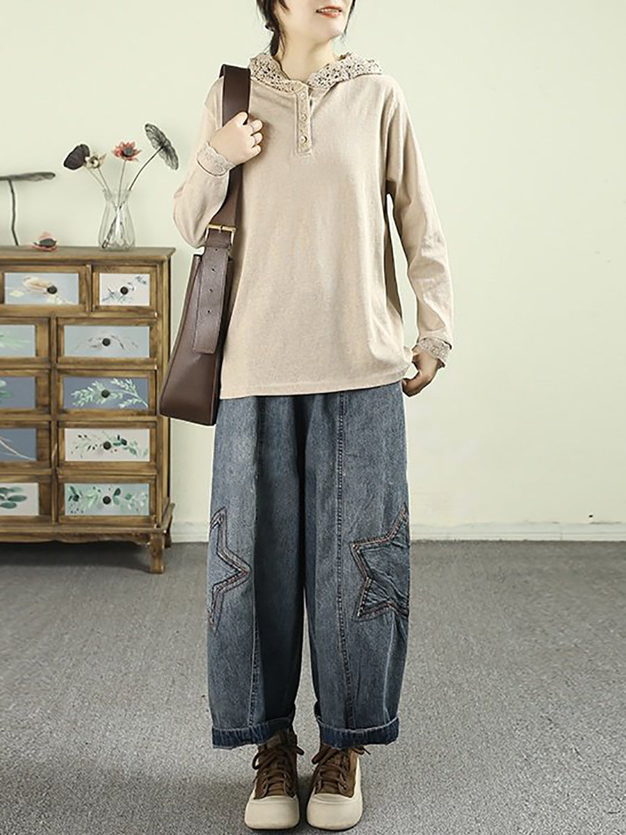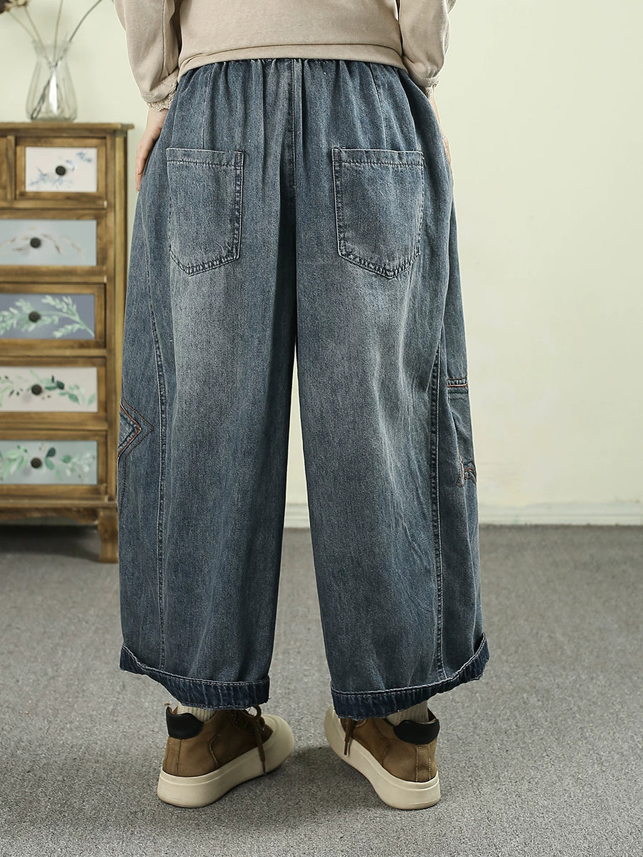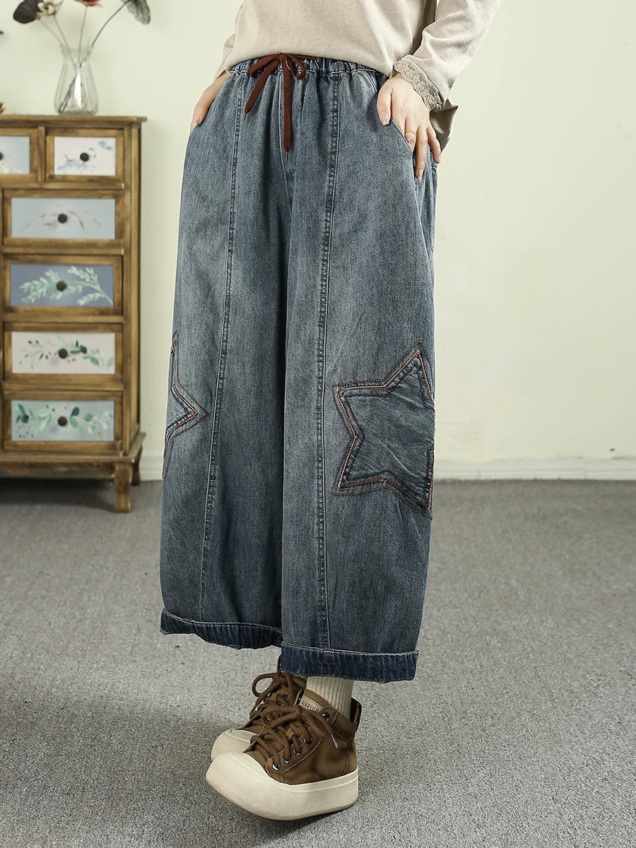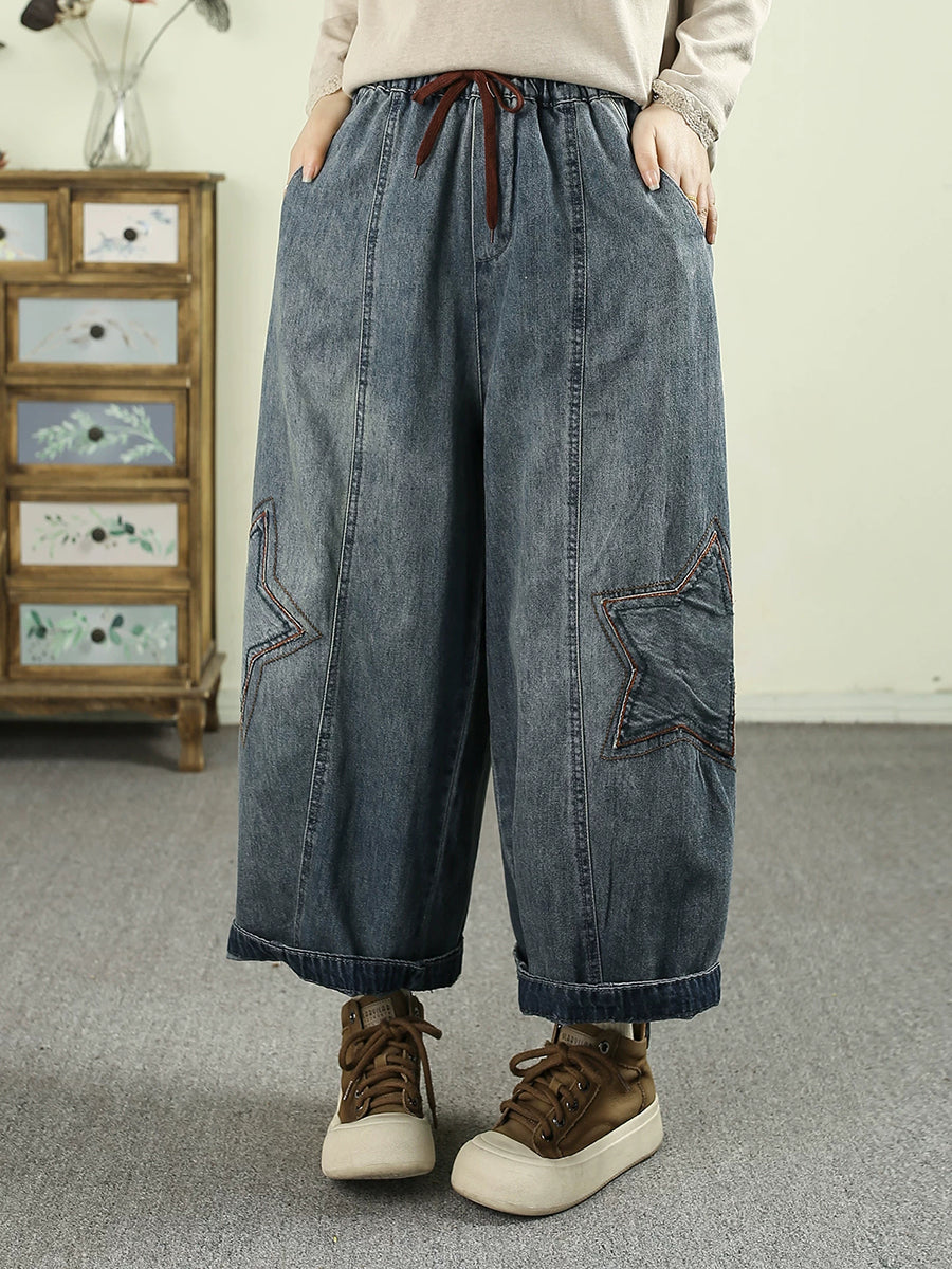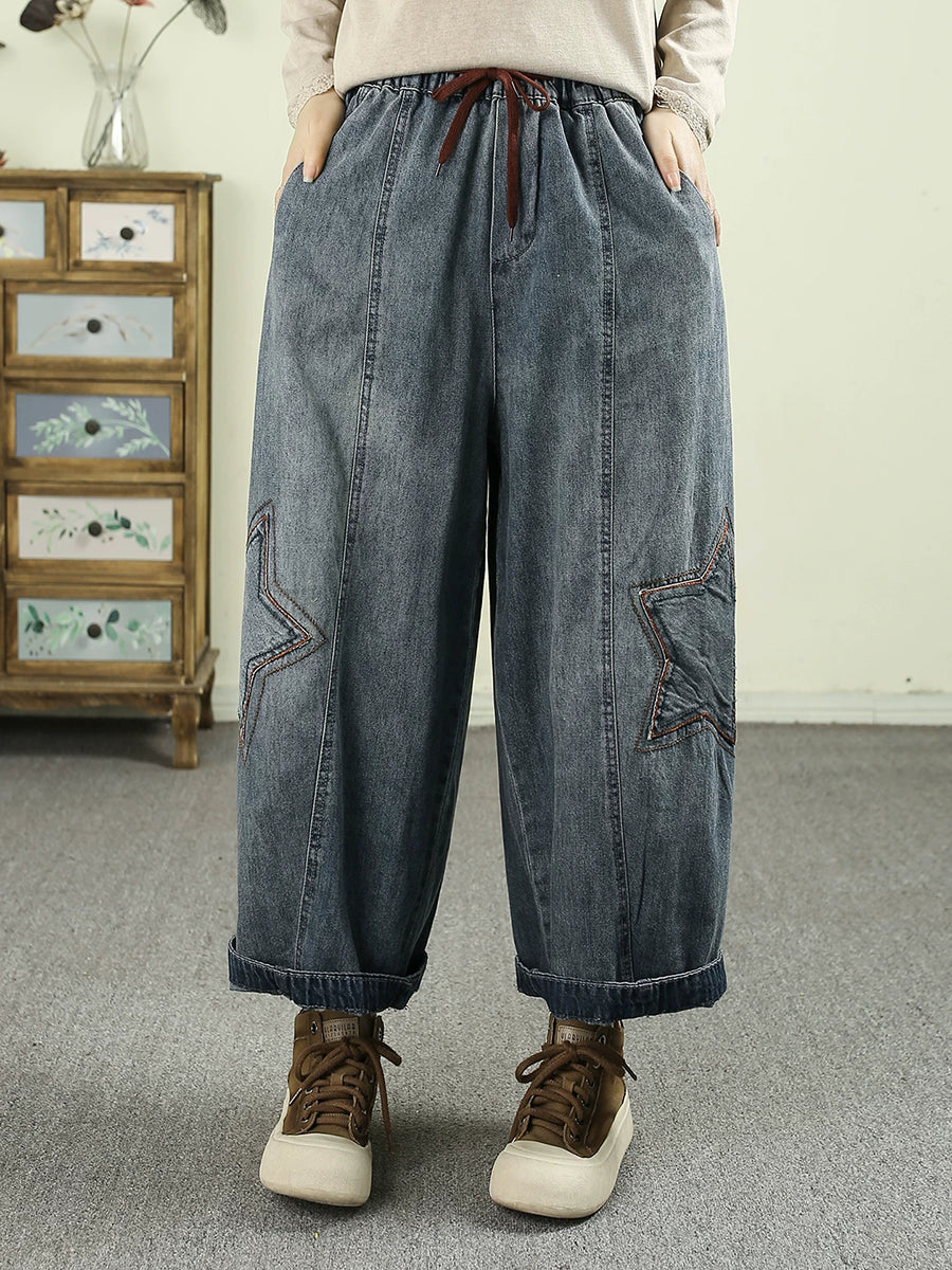 Women Spring Vintage Denim Star Spliced Harem Pants