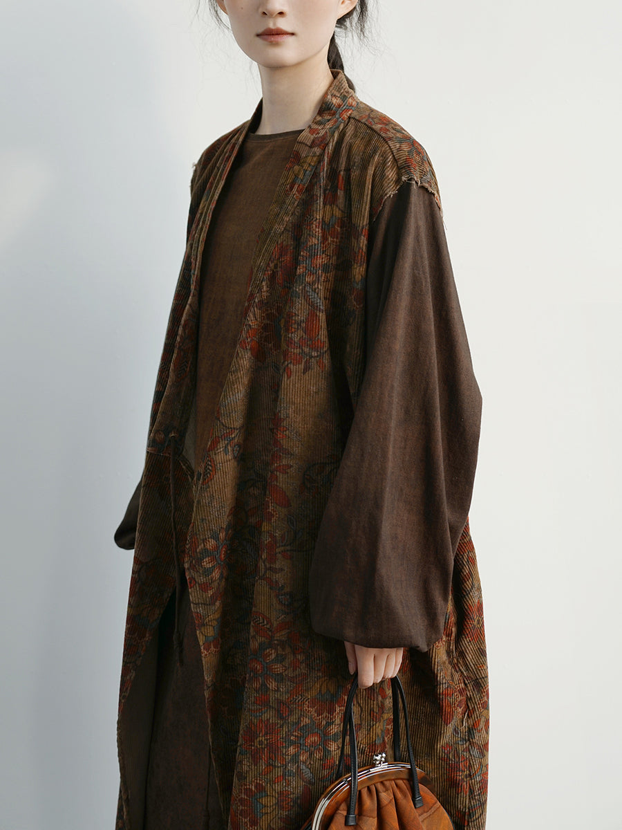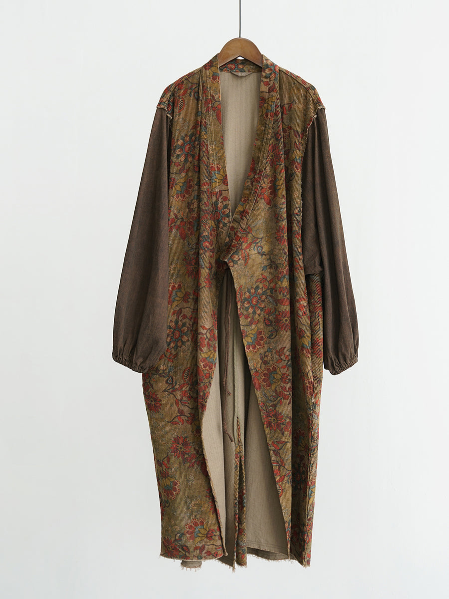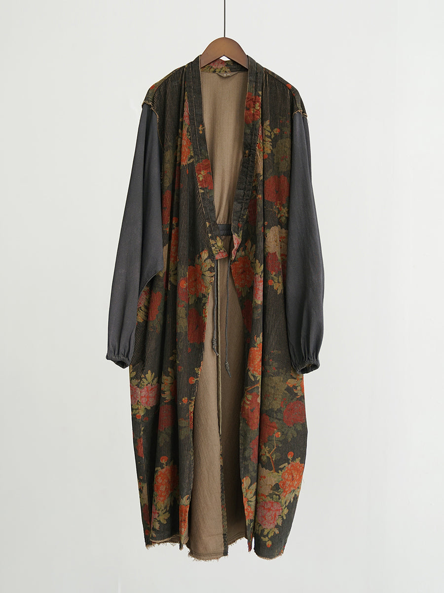 This long coat is made of 100% cotton and features a vintage-inspired flower pattern. The v-neck collar and full, regular sleeves make it perfect for the autumn and winter seasons.