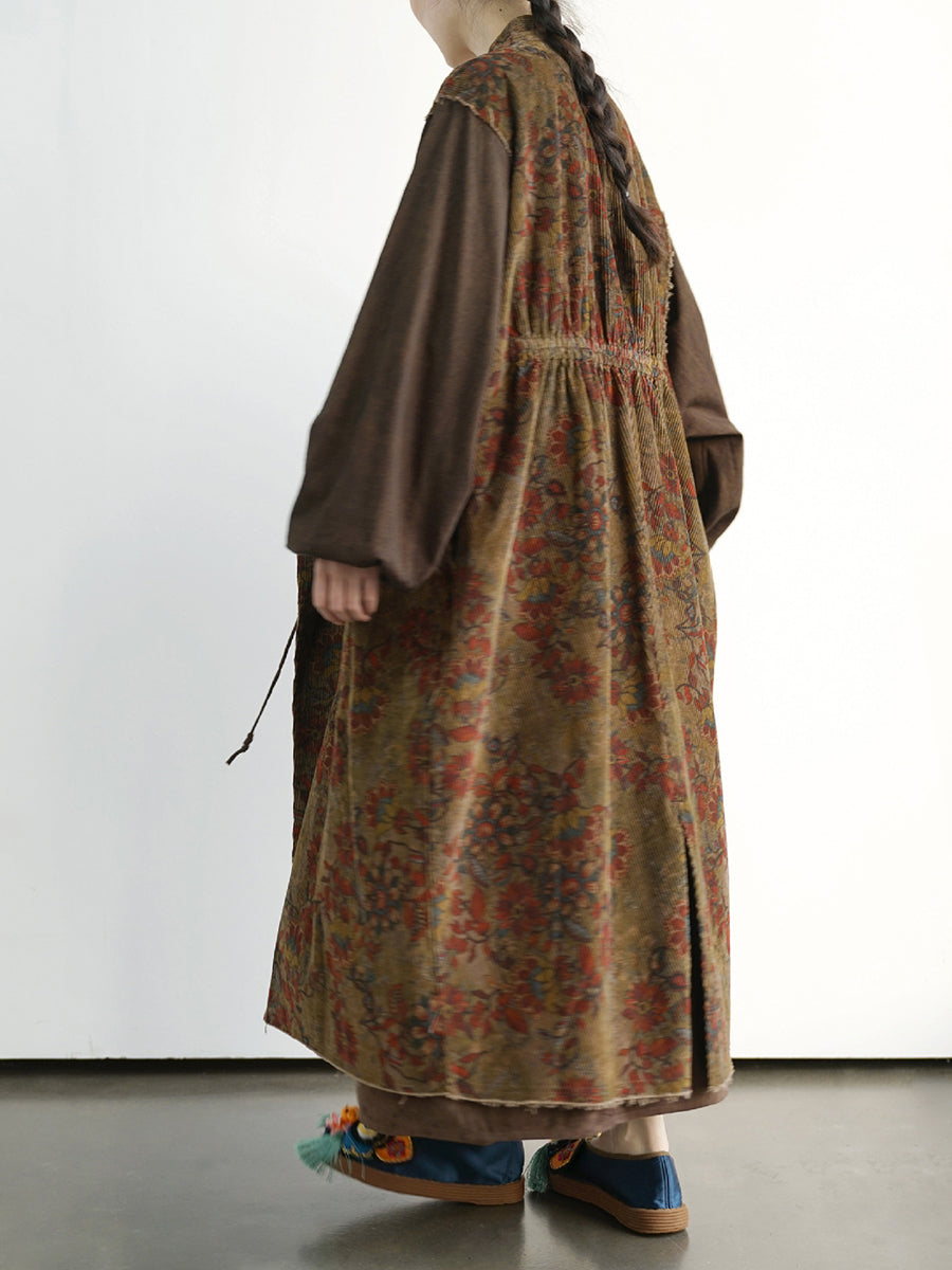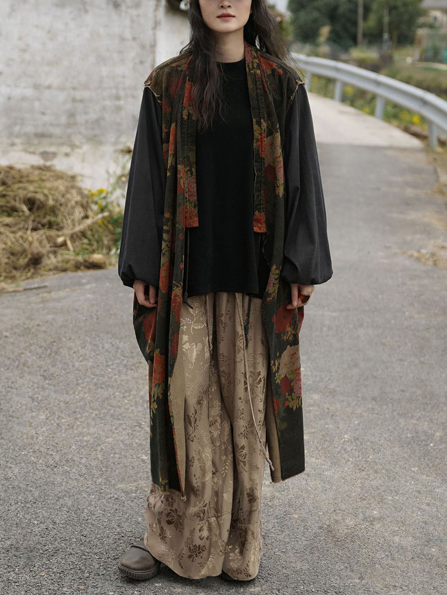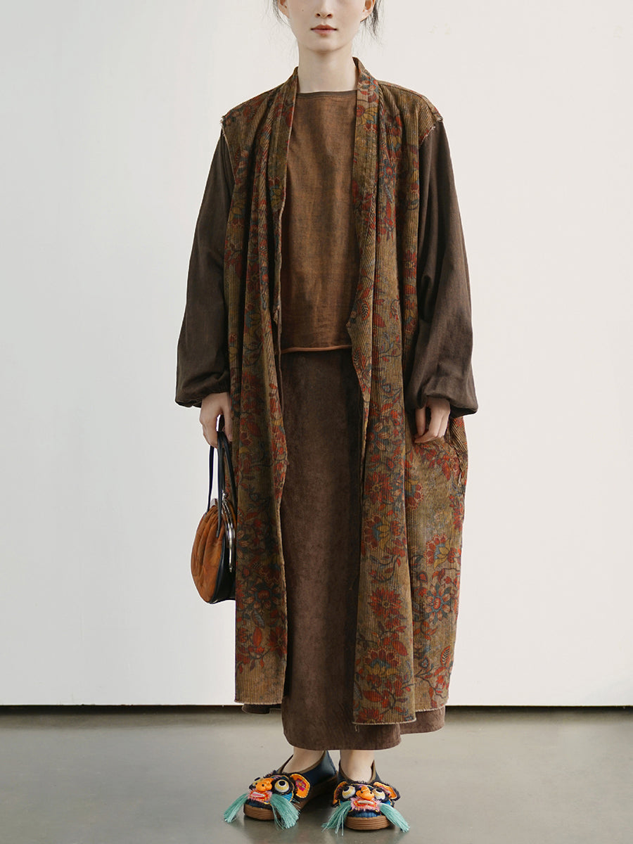 This long coat is made of 100% cotton and features a vintage-inspired flower pattern. The v-neck collar and full, regular sleeves make it perfect for the autumn and winter seasons.